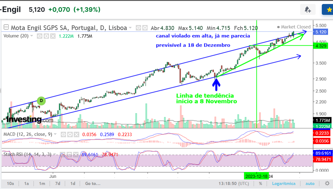 Ate a saida dos resultados, a Mota estará a seguir o seu caminho, identificado da analise técnica, atingirá os 6.4€. Mediante os resultados apresentados de 23 a aprovacao do dividendo entregue este ano, podera atingir o máximo histórico os 8€