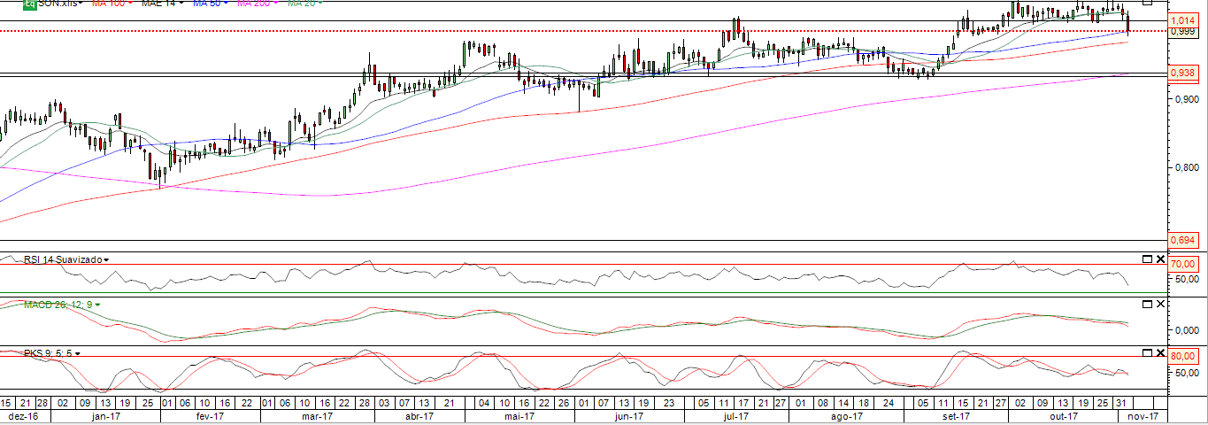Se quebrar em fecho em baixa a MM50 e 0.98, poderá ir testar o próximo suporte entre 0.90 e 0.93 onde se situa a Mm200 que também poderá servir de suporte numa possível correcção.