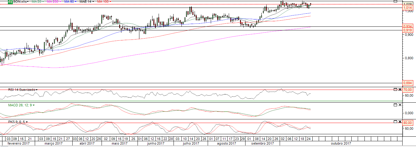 Bom comportamento hoje na Sonae. Os 1.016/1.017 têm servido de suporte nesta lateralização que já dura há 12 sessões. Vamos ver se rompe em alta e faz novos máximos relativos.