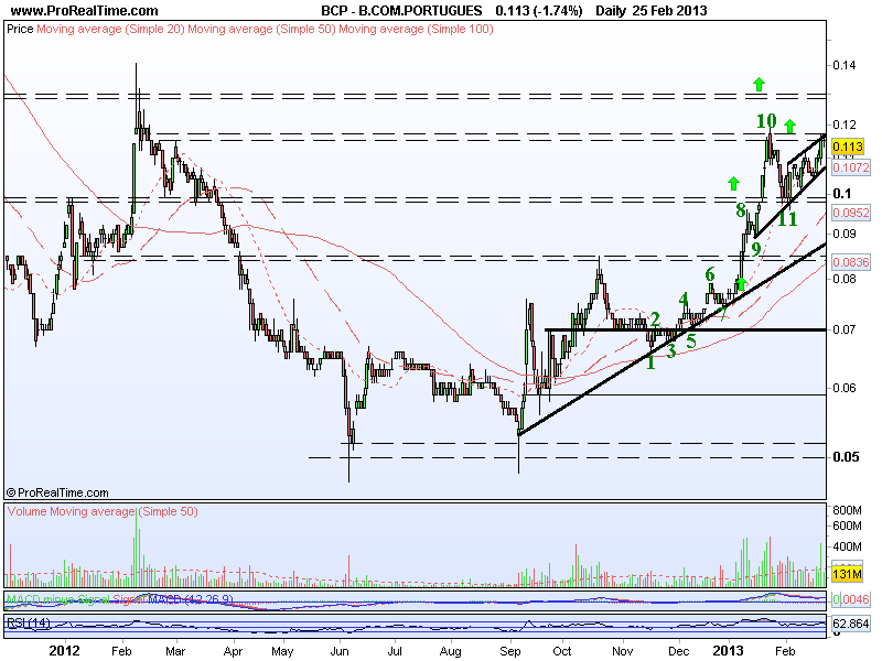 A minha visão do BCP que na 1h encontra-se dentro de um canal ascendente sem aparentes divergencias. Bons pontos de entrada são a obvia quebra do maximo de 24 de Janeiro, nos 0,12 ou, se atacar a base desse mesmo canal que se encontra nos 0,109-0,111.