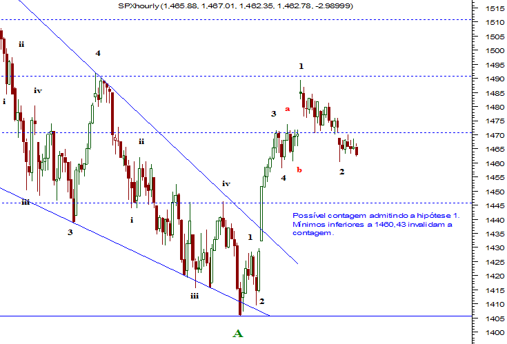 Boas. Recapitulando o que tinha dito há uns dias atrás, havia duas hipóteses. Até agora a hipótese 2 prevalece embora eu esteja mais crente na primeira que ainda é possível, mesmo sabendo que o indicador maravilha diz que novos mínimos virão inferiores a 1406 pontos, e virão, mas até lá é possível que o índice quebre os 1490 para depois fazer novos mínimos. É por isto que digo que os movimentos são quase perfeitos, o problema é que deixam várias hipóteses em aberto, não permitindo fazer a melhor previsão.
