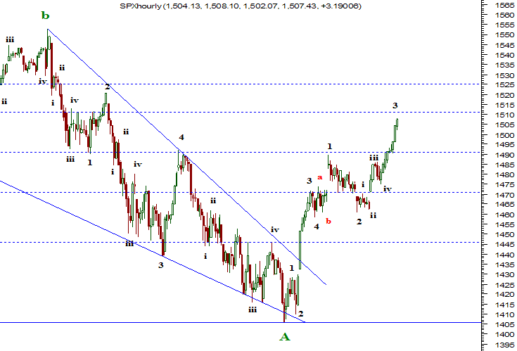 Boas. Aconteceu algo estranho no final da sessão e que me deixou dúvidas. Ao quebrar em baixa o mínimo de ontem, continuou a malhar ao que parecia a continuação da 4ª onda desde os máximos de ontem nos 1527, mas depois recuperou e quebrou em alta o mínimo de ontem, aqui tive que fechar o short pois deste modo o índice fez apenas uma correcção ABC. Se é uma correcção ABC, então o índice terá que voltar para cima. Mesmo com este raciocinio fiquei com dúvidas e não arrisquei entrar longo. Veja-se o chart de 5 minutos.