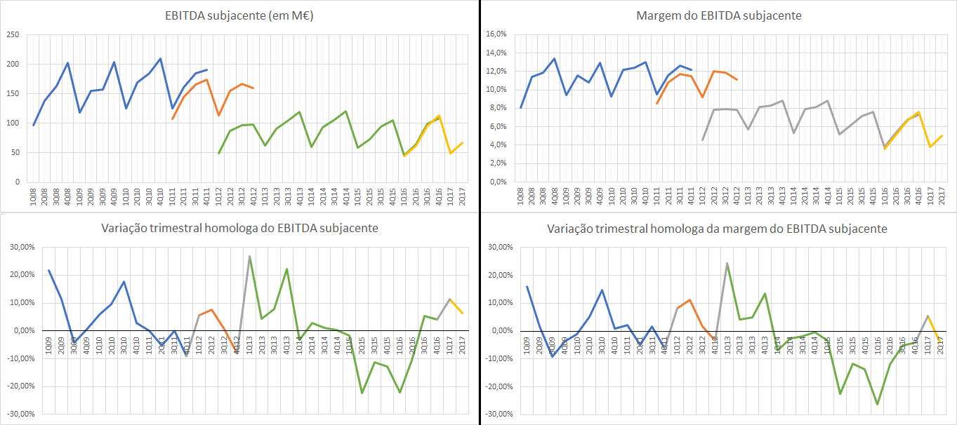 youmeu Escreveu:Vamos lá analisar o gráfico da variação trimestral homóloga do EBITDA subjacente com o do preçoPrimeiro que tudo à que tentar ajustar o eixo temporal para que os períodos sejam idênticos. Para tal tentei que a data no qual os resultados são lançados esteja por baixo do dia onde estes foram lançados e não propriamente ao período que corresponde. Isto é, mesmo sabendo que os resultados do 2Q 2017 correspondem ao período de Abril a Junho estes foram ajustados para corresponder à data em que se deu o comunicado, ou seja, Agosto.