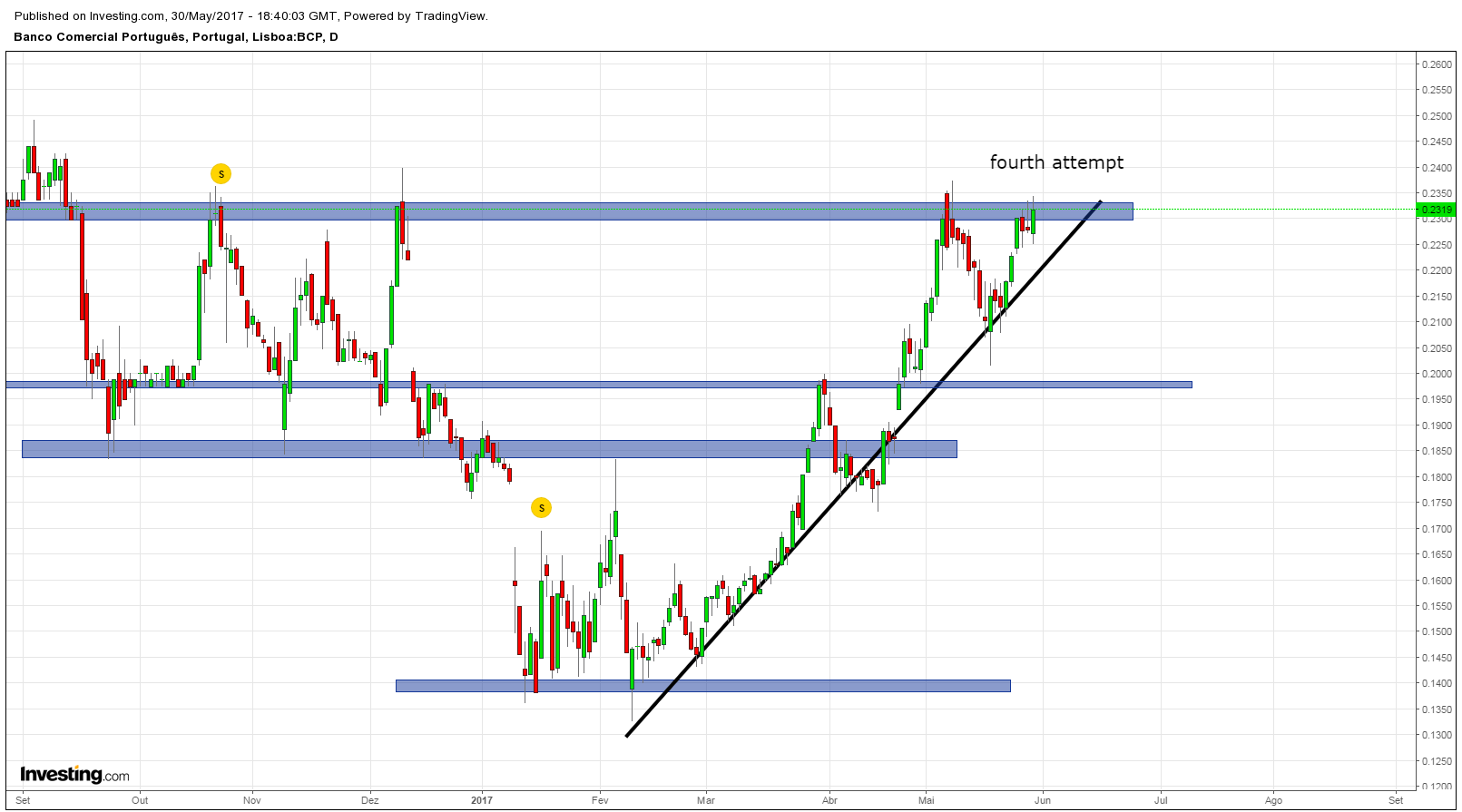 Hoje é a 3ª tentativa de romper os 0.23€.