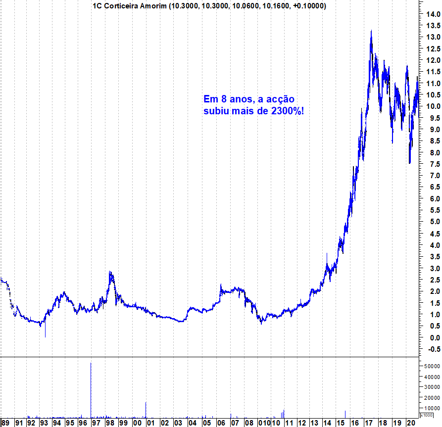 Aquilo que quero acrescentar neste tópico é o gráfico de longo prazo da Corticeira. Na verdade, olhando para a correcção dos últimos anos, é apenas um movimento normal depois de um crescimento absolutamente inacreditável da acção que multiplicou por mais de 24 o seu valor em Bolsa em 8 anos. Sim, é uma acção da Bolsa portuguesa.