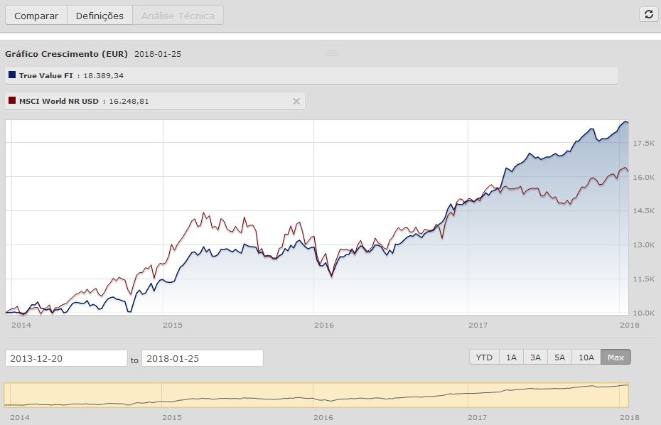 Esse fundo é denominado em USD, (a não ser que tenhas comprado com uma conta em USD, e assim controlas o risco cambial), acabas por ser comido através do câmbio EURUSD, que tem uma tendência médio/longo prazo de ser valorizar. No último ano, o EURUSD passou de 1,03xx para 1,24xx, EUR ganhou cerca de 20% face ao USD. E com "fim á vista" do QE do BCE, a entrada de capital ex-Zona Euro (ZE) em acções da ZE e as políticas de desvalorização do USD de Mr. Trumpa, o EUR é a subir face ao USD. Repara na rendibilidade a 1 ano desse fundo quando convertido para EUR (imagens abaixo) = +2%, enquanto que o retorno "puro" (sem conversão cambial) é = +18%.