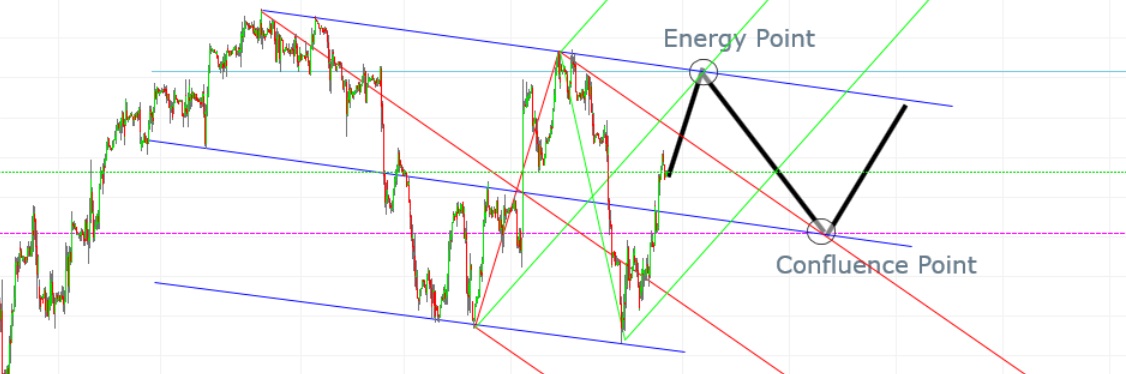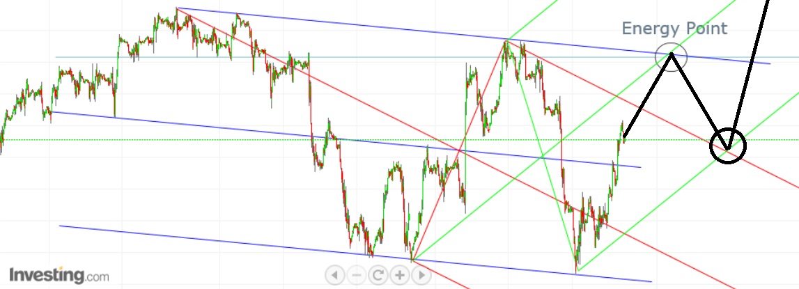 estive a pensar e não me agrada por aí alem a interacção do preço com a fork ascendente (verde), ainda assim mantive-a para ter uma previsao da eventual subida de preço. no entanto, parece-me casar bastante melhor com o preço, o canal azul (a sua median line tem maior interacção com o preço), e na intersecção deste com a fork vermelha encontra-se o confluence point que, por essa razão, me parece fazer mais sentido do que o 2º energy point do gráfico anterior.
