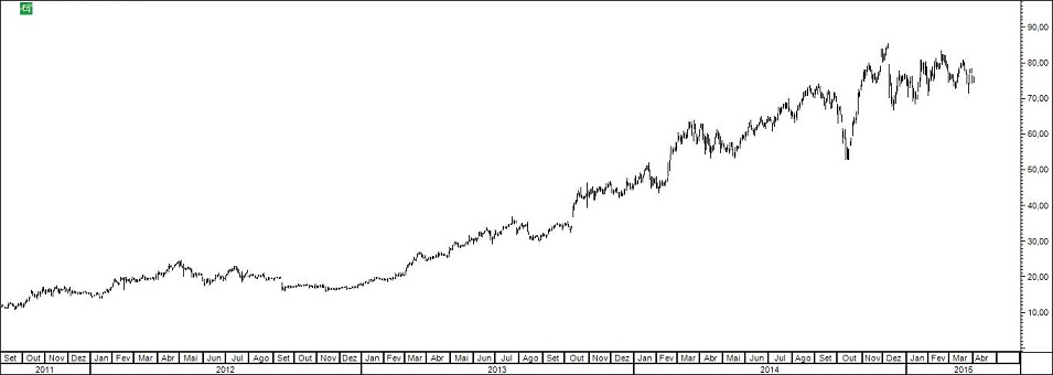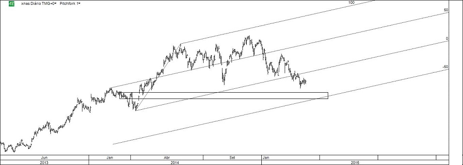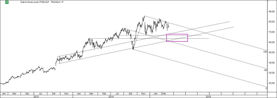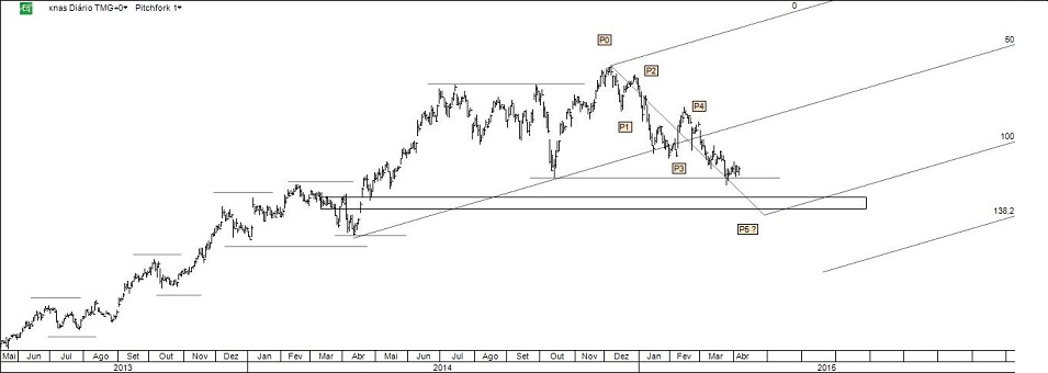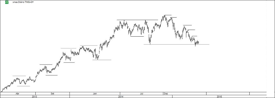 Pelo gráfico que agora apresento falta cerca de 4% para o target (RL). Necessariamente subindo a stop profit e ponderando seriamente fechar a posição: as linhas podem ser muito interessantes, mas o que importa é alcançar o desiderato do FI Alquimia 2015 indo de resultado em resultado.