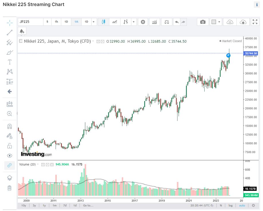 Repito, quando o Japão parou de crescer loucamente, o Nikkei colapsou a um ponto que ainda hoje não voltou a máximos, embora esteja lá perto...