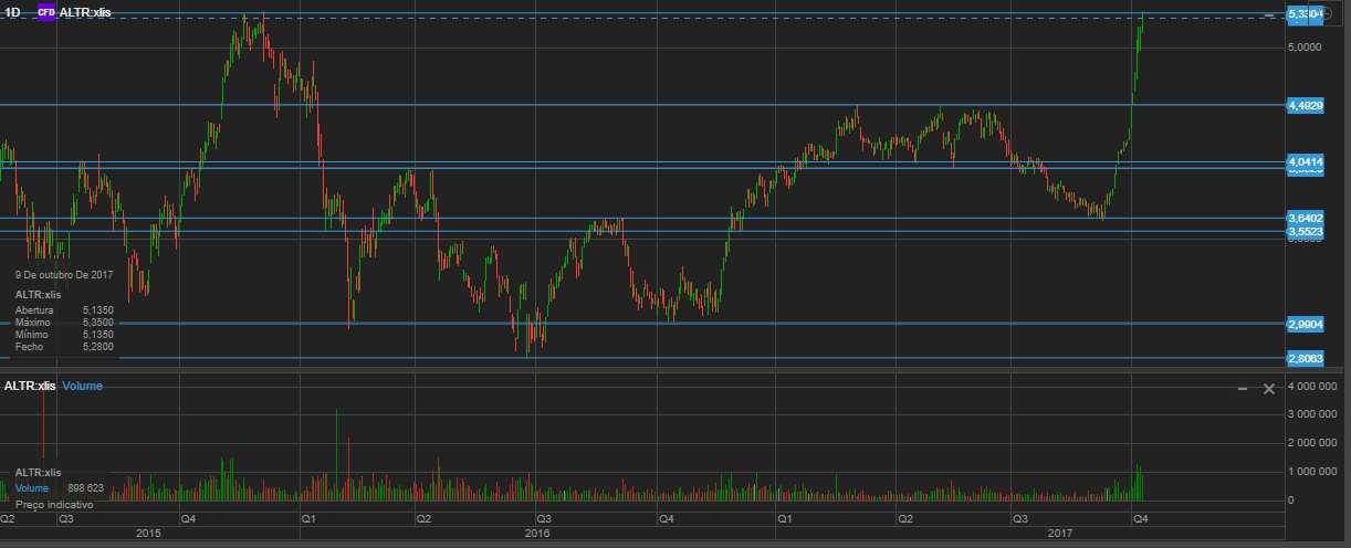O gráfico que tenho do ProRealTime não bate certo com os que já vi por aqui ... pelo meu ProRealTime o máximo histórico teria sido a Novembro 2015 por volta dos 4,40€, valor testado em ínicio de Junho 2017 e quebrado de vez no final de Setembro / iniico de Outubro. Não esperava esta subida tanto tempo seguido sem respirar.