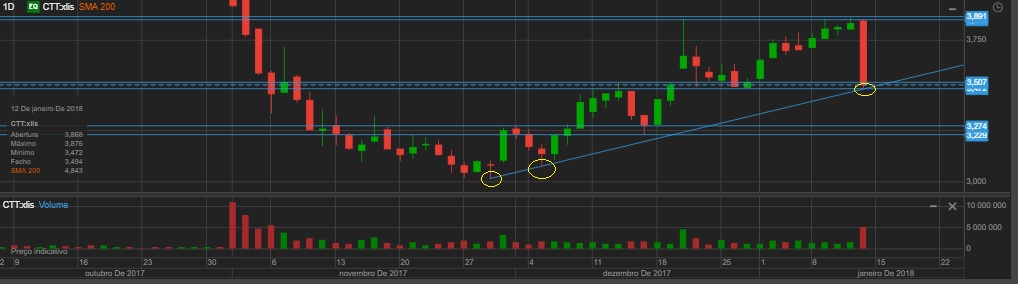 Bom, isto na AT cada um desenha as linhas que entender, mas as minhas (e penso que também as do _x_), não mostram quebra nenhuma de nada. É verdade que uma vela destas com um volume destes deixa uma pessoa desconfiada, mas há que seguir a estratégia. E na minha, esta é uma zona de compra, e não de venda. E então lá meti mais um pouco de carga no contentor. Agora, se quebra aqui esta zona, é preciso assumir a perda e seguir pra outra. Enquanto isso não acontecer, os CTT para mim podem ainda ser um dos negócios de 2018. Veremos.