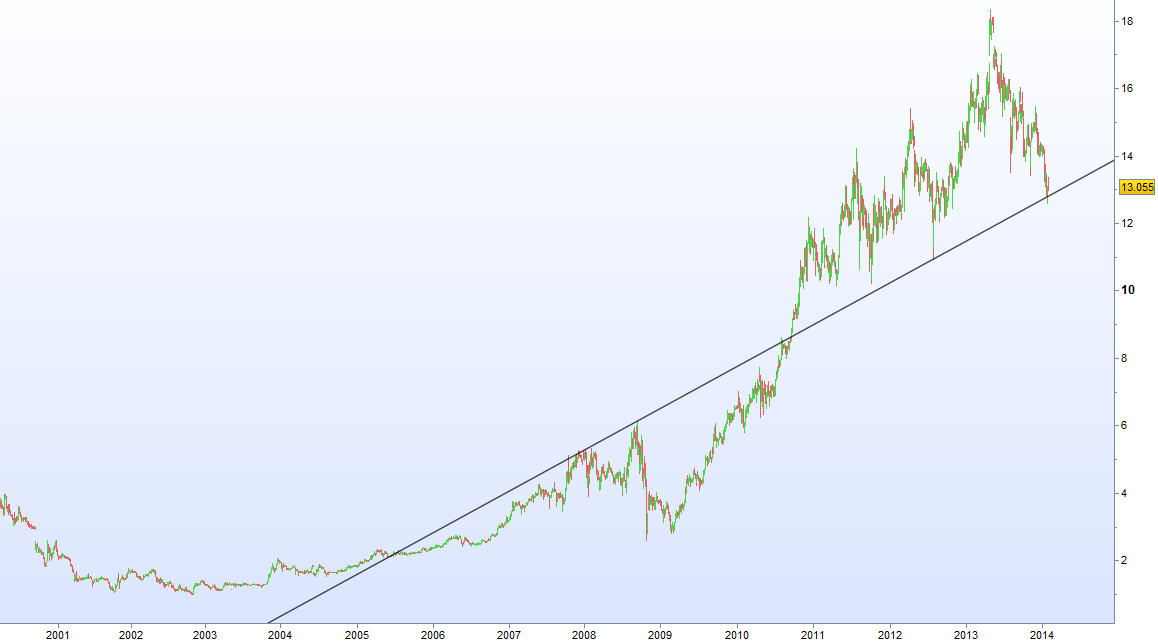 olhando para esse grafico, como já tinha visto a uns dias atrás, dá-nos a ideia que está prestes a virar a tendencia e até meados do ano, ou por volta da data dos dividendos estará entre os 15€ e os 16€... apenas uma opiniao baseada em AT de longo prazo e AF dos fundamentais da JMT...