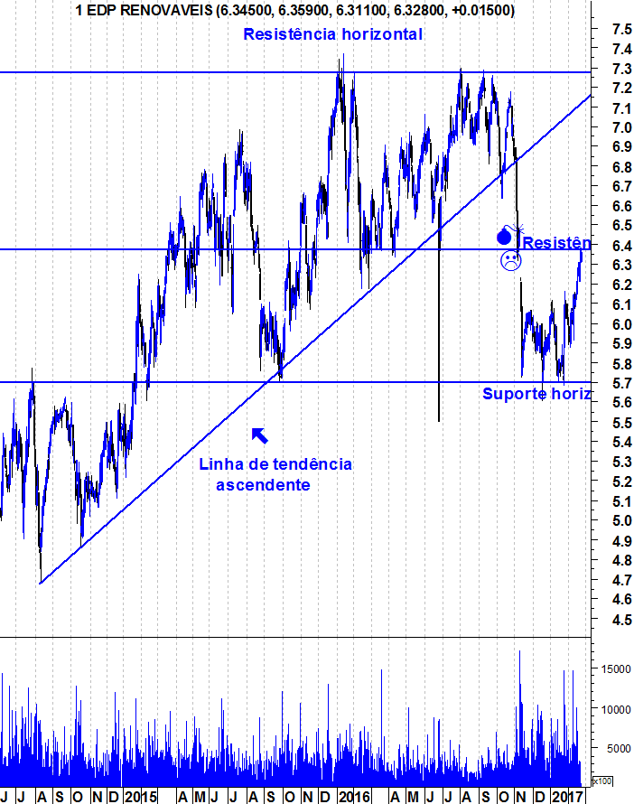 Obrigado pela atualização. A reação à resistência não foi a melhor, como podemos ver no gráfico e um fecho abaixo dos 6,08€ (anterior minimo relativo ocorrido a 28/02/2017) pode precipitar a ação de novo para baixo dos 6,00€. Não sei se partilham desta opinião.