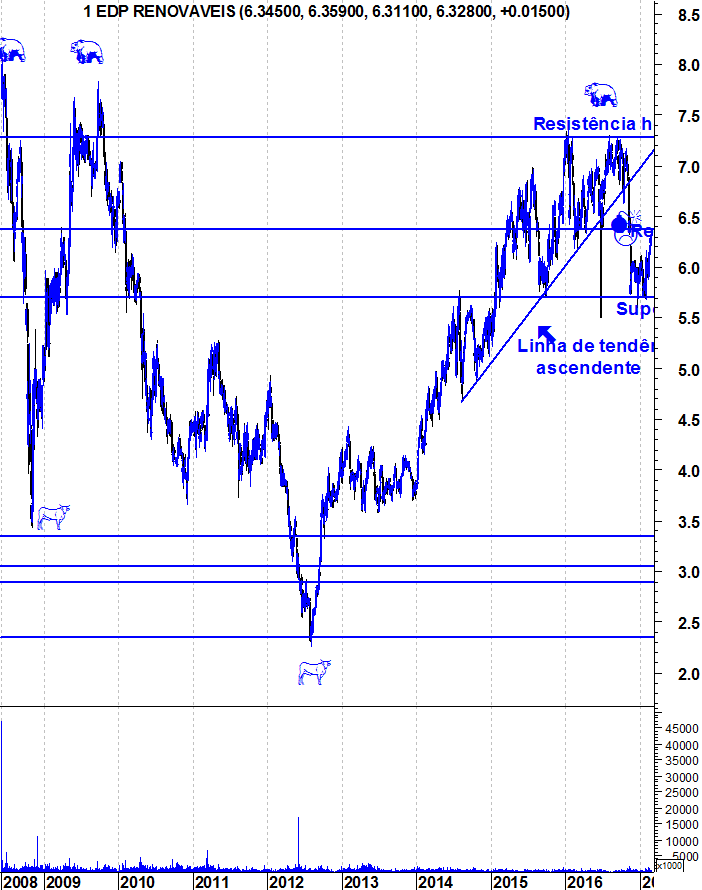 Deixo aqui os gráficos actualizados da EDPR, numa altura em que a acção está colada à sua resistência horizontal.