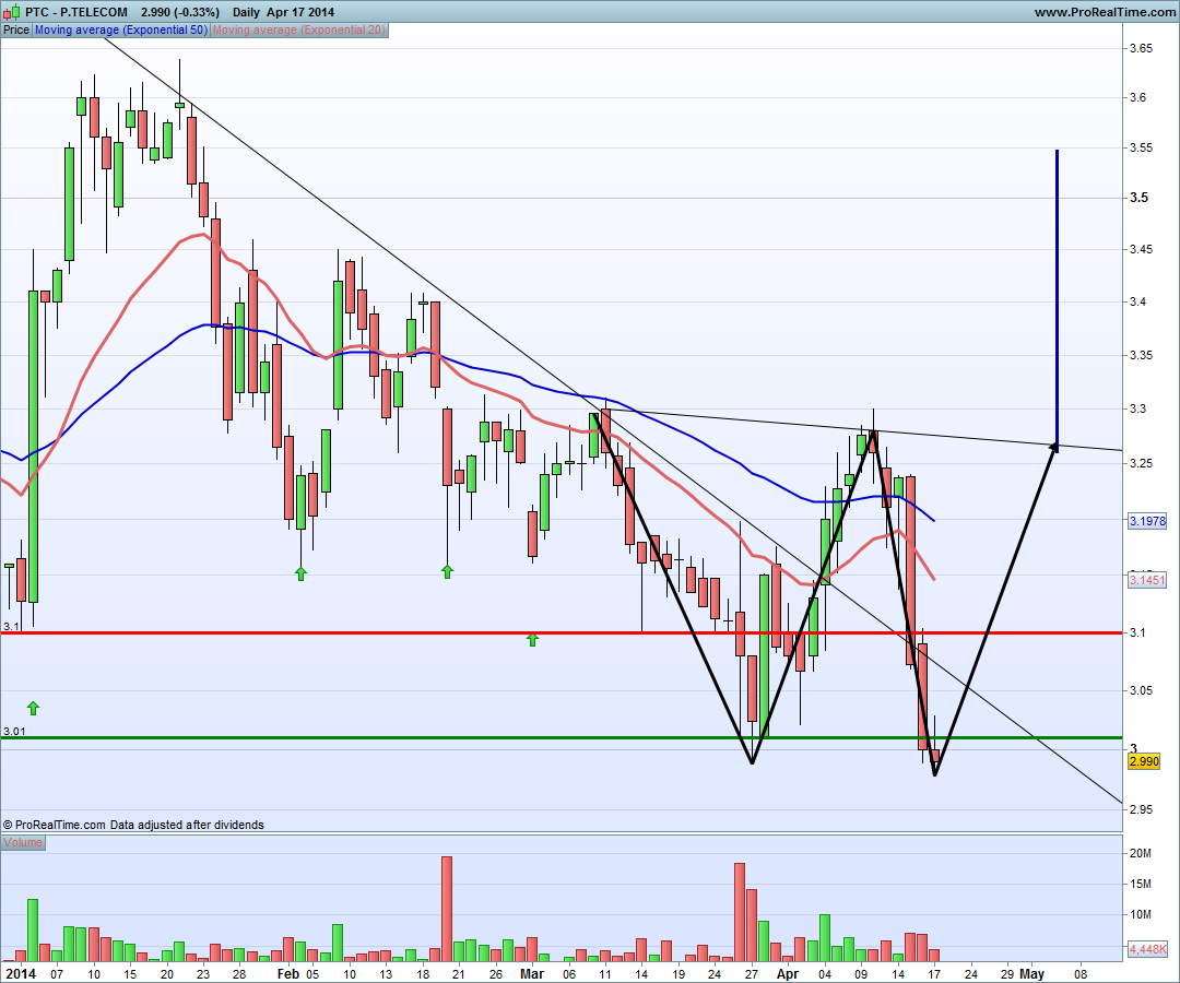 Aqui fica um update do que pode acontecer daqui para a frente. Era excelente hoje terminarmos com um volume acima da média. Se repararmos na ultima queda , o volume foi baixíssimo. Hoje por esta hora, já temos mais volume do que todo o dia de quinta feira ( ultimo dia de bolsa da semana passada). Era importante desta vez, termos uma subida consistente, com bom volume, ao contrário da ultima vez que tinha dito que, o volume na subida era fraco sem consistência e a verdade é que acabou por cair novamente. Desta vez, temos força compradora, vamos ver se é desta que a PT dá um salto.Acredito numa ida novamente pela casa dos 3.30, mas para ser quebrada, tem de lá chegar com bom volume. Fica aqui o gráfico daquilo que pode acontecer, vamos aguardar e ver nas próximas sessões que vão ser fundamentais para a PT.Esqueci-me de referir que um fecho acima dos 3.06 aproximadamente era um bom sinal. Temos um canal descendente que foi quebrado e levou a acção aos 3.30 aproximadamente.caso esse canal seja quebrado acredito numas boas subidas nas proximas sessoes.