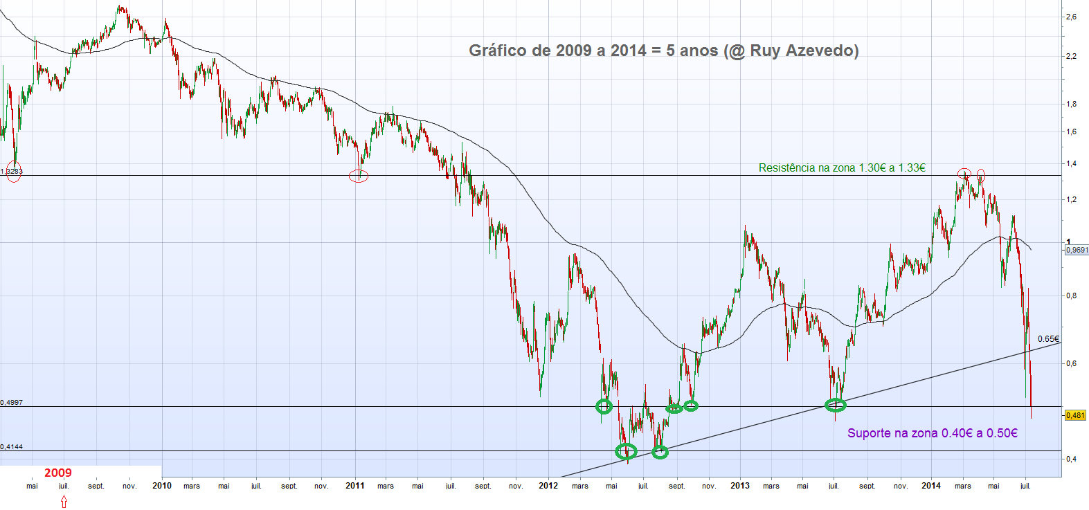 Na minha opinião os mais propensos ao risco podem fazer uma 1°entrada LONGO (ou entrada parcial, para reforçar posteriormente) na zona 0.40/0.50€. Se esta zona/suporte aguentar pode aqui conseguir-se uma entrada interessante para o longo prazo.