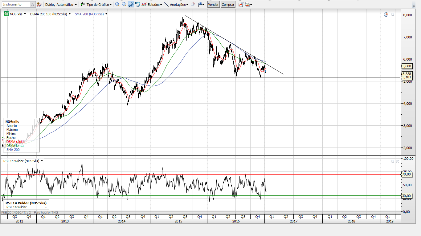 É impressão minha ou consegue desenhar-se um grande triângulo no médio prazo no gráfico diário da NOS. Abri posição curta a tentar aproveitar o ressalto na resistência e estava a pensar vender no suporte, mas considerando o desenho e o aspecto do PSI20 talvez haja aqui alta probabilidade de uma boa queda. O que dizem?