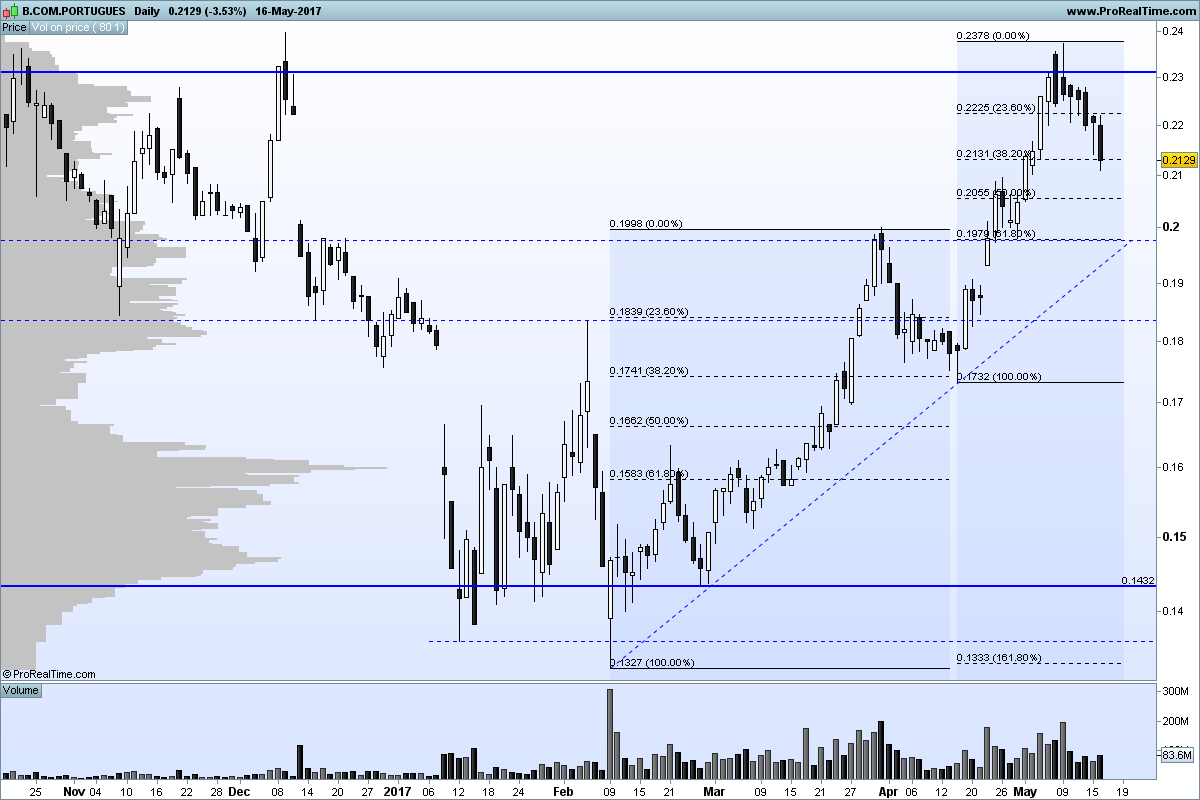 Fecho em cima dos 38,2% de retracção de Fibonacci do último movimento ascendente iniciado nos 0,1732€ e que culminou nos 0,2375€. No último movimento descendente a correcção ficou mais ou menos por aqui (Movimento ascendente iniciado a 0,1432€ até aos 0,20€ com correcção até aos 0,1785€, que representavam a retracção dos 38,2% de Fibonacci). Vamos ver se o movimento se repete, temos o RSI já próximo dos 50 à semelhança do anterior movimento ascendente. Parece-me um bom ponto de entrada face ao exposto.