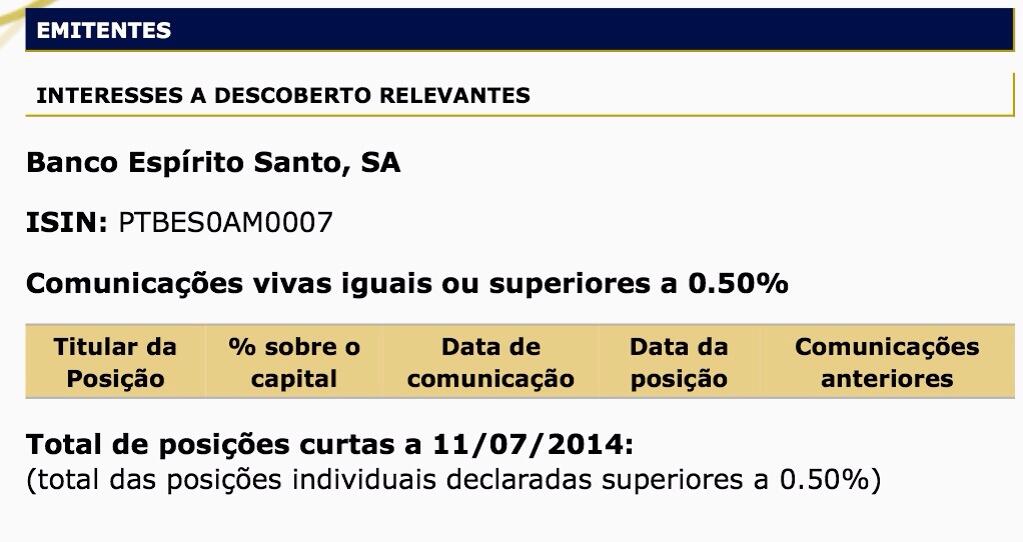 Aparentemente não há posições curtas relevantes no BES, mas devem existir muitas dos pequenos investidores.