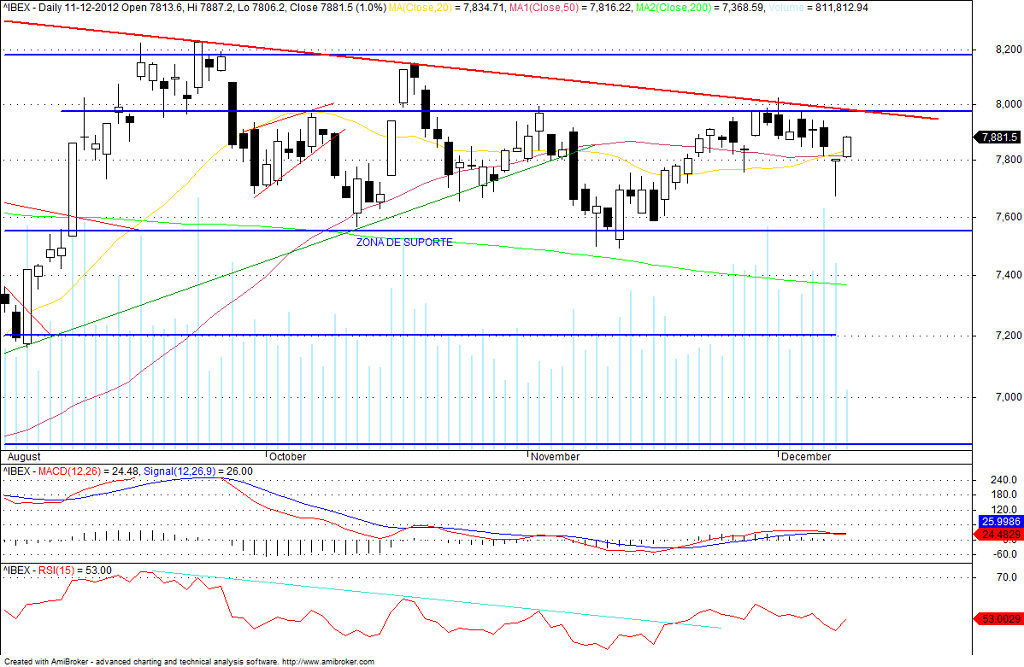 A confirmar-se este movimento de consolidação dos 8000 pontos como zona de suporte será que não estamos perante o início do bull market no Ibex? Na minha opinião começo a acreditar cada vez mais nesta hipótese que será totalmente confirmada caso a quebra dos 8250 pontos seja também confirmada.