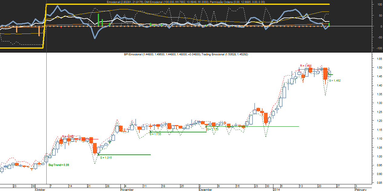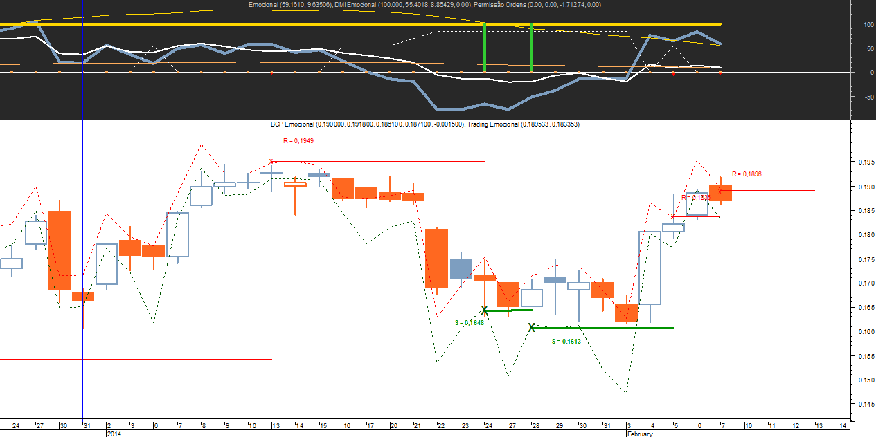 Os indicadores atrás indicados, que formam a base da definição da tendência no "Emocional 2014" podem-se resumir a 2 indicadores que são visualizados no gráfico de cima do BCP (ver gráfico no final deste post).