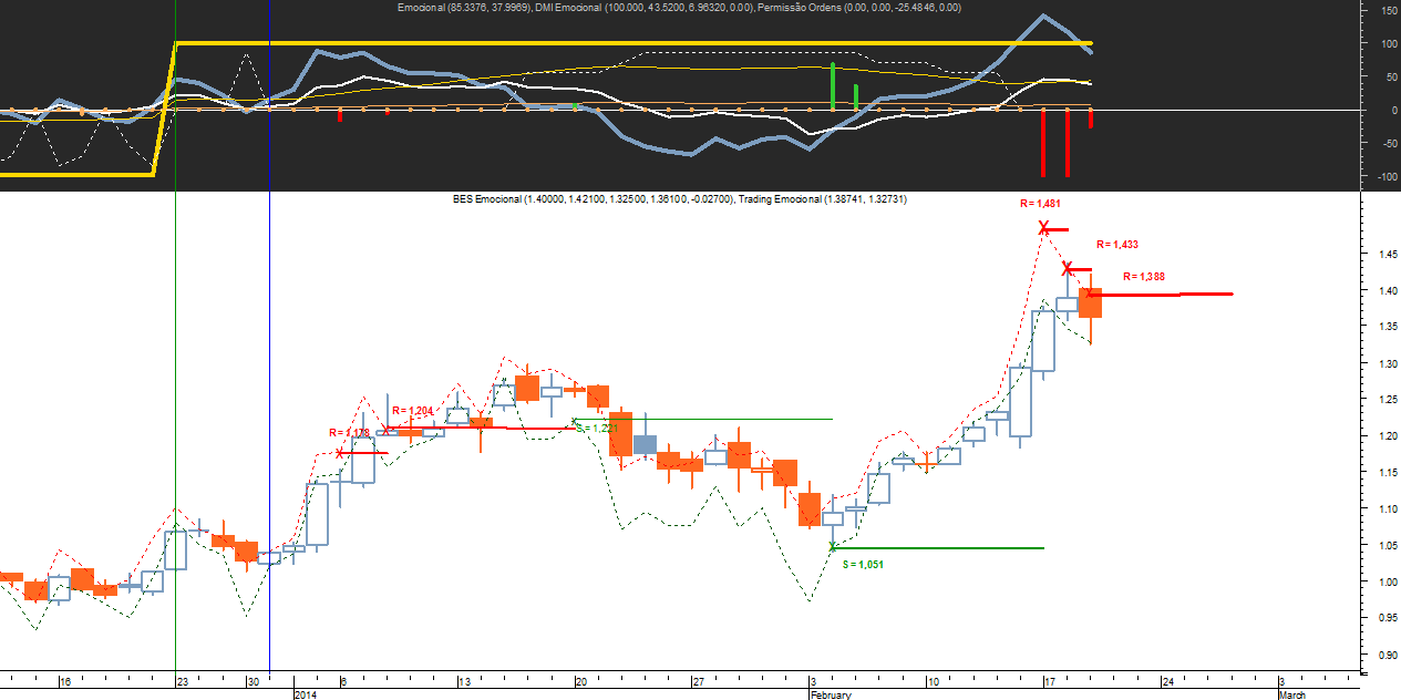 No final da sessão de 2ª feira o programa assinala no BES a deteção de uma resistência importante, para vender a totalidade da componente oscilatória, isto para o caso da cotação atingir, na sessão do dia 18 de fevereiro, o valor de 1,481 €, um valor que o programa assinala como possível nível de resistência aproximada de curto prazo.