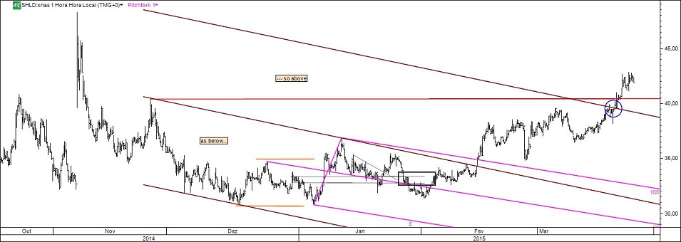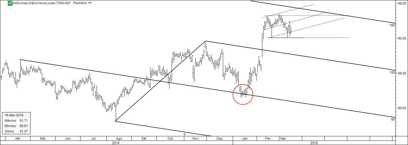 À medida que o tempo avança o target vai melhorando ou piorando em relação ao cálculo inicial. No caso da has, uma vez que wl é descendente, o target vai piorando. A stop profit está colocada acima do último swing low relevante.