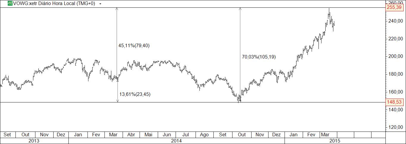 Há já algum tempo que ando a apregoar uma abordagem simples por parte de quem quer estar directamente envolvido no mercado accionista sem cair na tentação do trading especulativo. Esta abordagem pode ser uma alternativa ou um complemento à exposição a fundos de investimento, etfs, e outros produtos de investimento colectivo e não exige especiais conhecimentos técnicos (muito pelo contrário). Aquando da criação dos meus tópicos e por ocasião de outros assuntos sugeri que se olhasse para a Volkswagen: é alemã, é europeia, é mundial, está ao nosso lado. Vejam o comportamento da acção desde há cerca de um ano, altura em que comecei a participar no caldeirão. Houve sofrimento durante o percurso? Houve (perda potencial de 13%). Mas o resultado é saboroso, não (ganho potencial de 45%)? Quem se predispôs a comprar no sell-off de Outubro passado vai com 70%. É por isso que digo que tentar duplicar o investimento num ano não é nenhum bicho de sete cabeças, desde que estejamos dispostos a aceitar o risco e a dar tempo ao tempo. Quem aceita que o seu fundo de investimento ou etf possa em certo momento apresentar uma perda de 10%-15%, tem de aceitar que um activo individual (uma acção) apresente a mesma perda. Esta é uma daquelas acções em que apetece alavancar a posição até ao tutano.