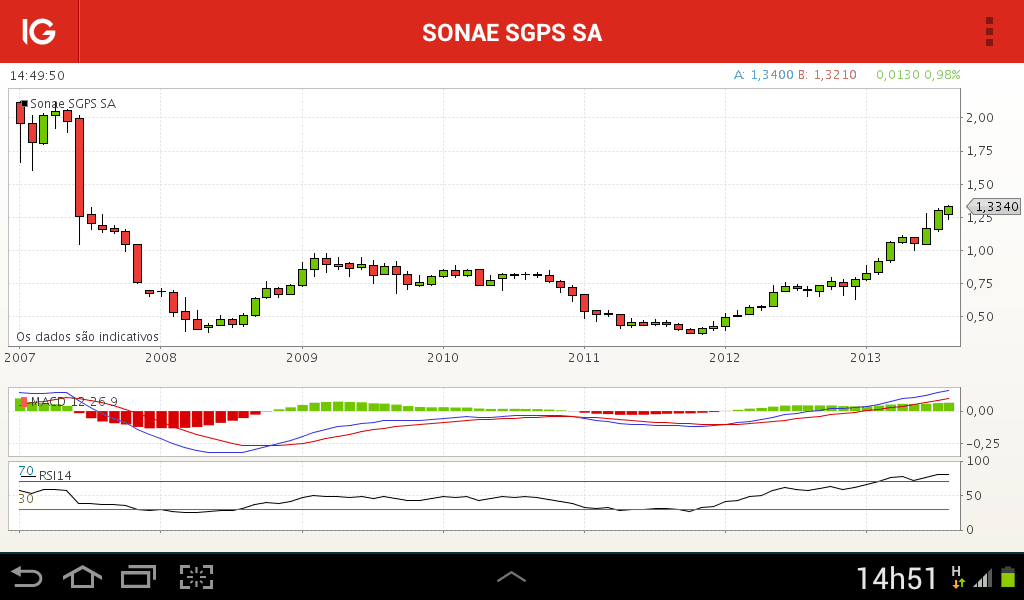Mais ou menos foi isso que se passou comigo. Claramente se o dinheiro que tens investido não te faz falta, não vendas, com a retoma económica o BANIF irá subir como viste nos últimos 6 dias úteis, para além de estar perto de um mínimo histórico, o facto de haver interessados em investir nele ou possíveis compradores por ser um banco relativamente pequeno. Eu estive perante uma situação semelhante, mas o dinheiro investido não era meu mas da minha mãe e ela gosta de saber se houve lucro ou perdas diariamente e quer lucro (ainda que pequeno) a curto prazo. Ora eu tinha cerca de 11000€ em acções do BANIF compradas a 0,0136 e elas sempre vieram por aí abaixo até aos 0,0113 tendo eu vendido a 0,0115 com perdas de 2000€ (lucro quase total do ano de 2013) sabendo que elas teriam que acompanhar o resto da banca que já tinha tido subidas fortes nos últimos 3 meses ainda que diárias e tal aconteceu como viste. Acho que a partir da subida de 8% deixou de ser um banco apático a meu ver e é como já disseram aqui. O céu é o limite para este banco e já agora também para o BCP dado que só se vê escalada atrás de escalada.