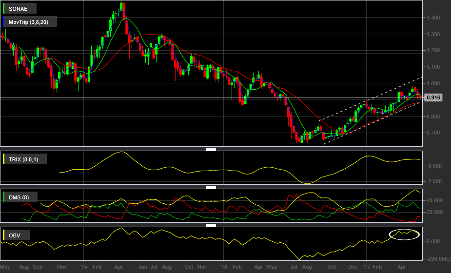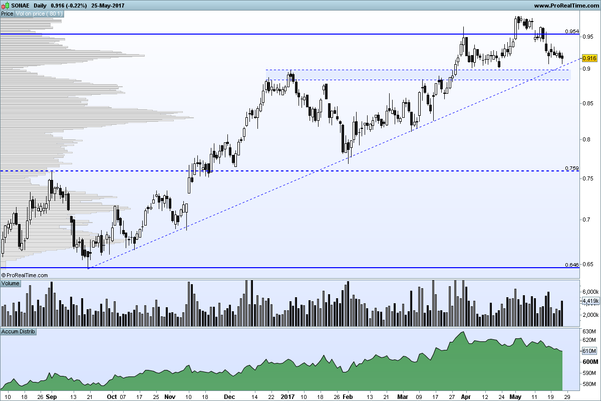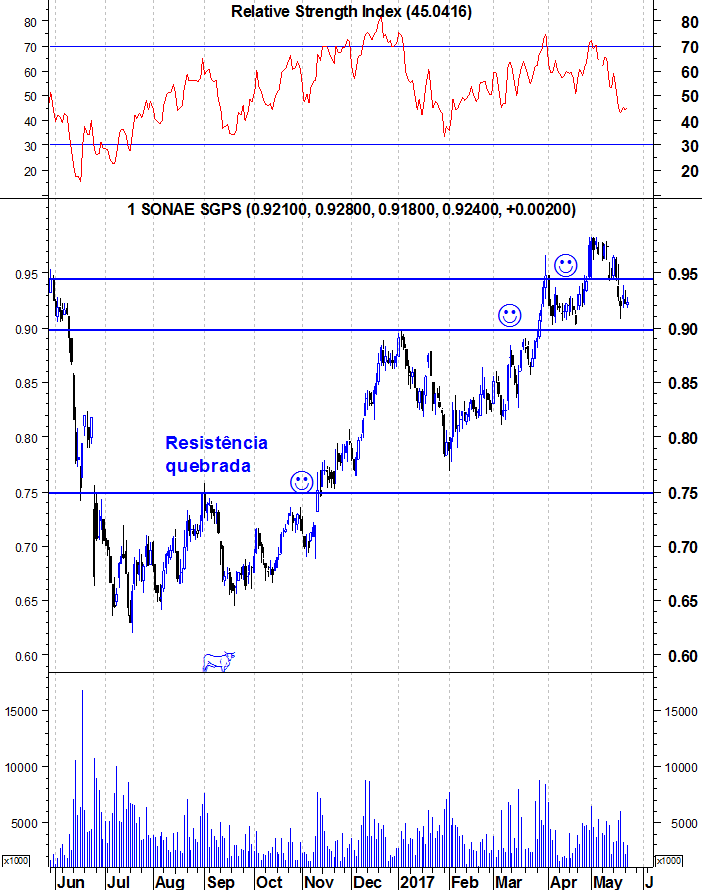 A zona dos ,90 foi relevante primeiro como resistência durante Dezembro e Janeiro. E bem forte. Uma vez conquistada em Março, foi retestada várias vezes com sucesso em Abril. O mesmo sucede agora à boleia do ex-dividend. Não digo que aguente. Mas está lá. E, se aguentar, caminho aberto para a Sonae deixar outra vez de ser penny stock. É claro que a Coreia do Norte pode atacar ou o bull nos EUA acabar, que já vai bem longo, mas enquanto não o fizerem...