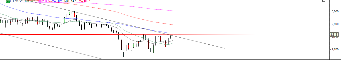Ali a EDP a fechar na resistência de cp nos 2,8€ ... mas convenhamos que não foi quebrada (a meu ver) ou pelo menos convincentemente