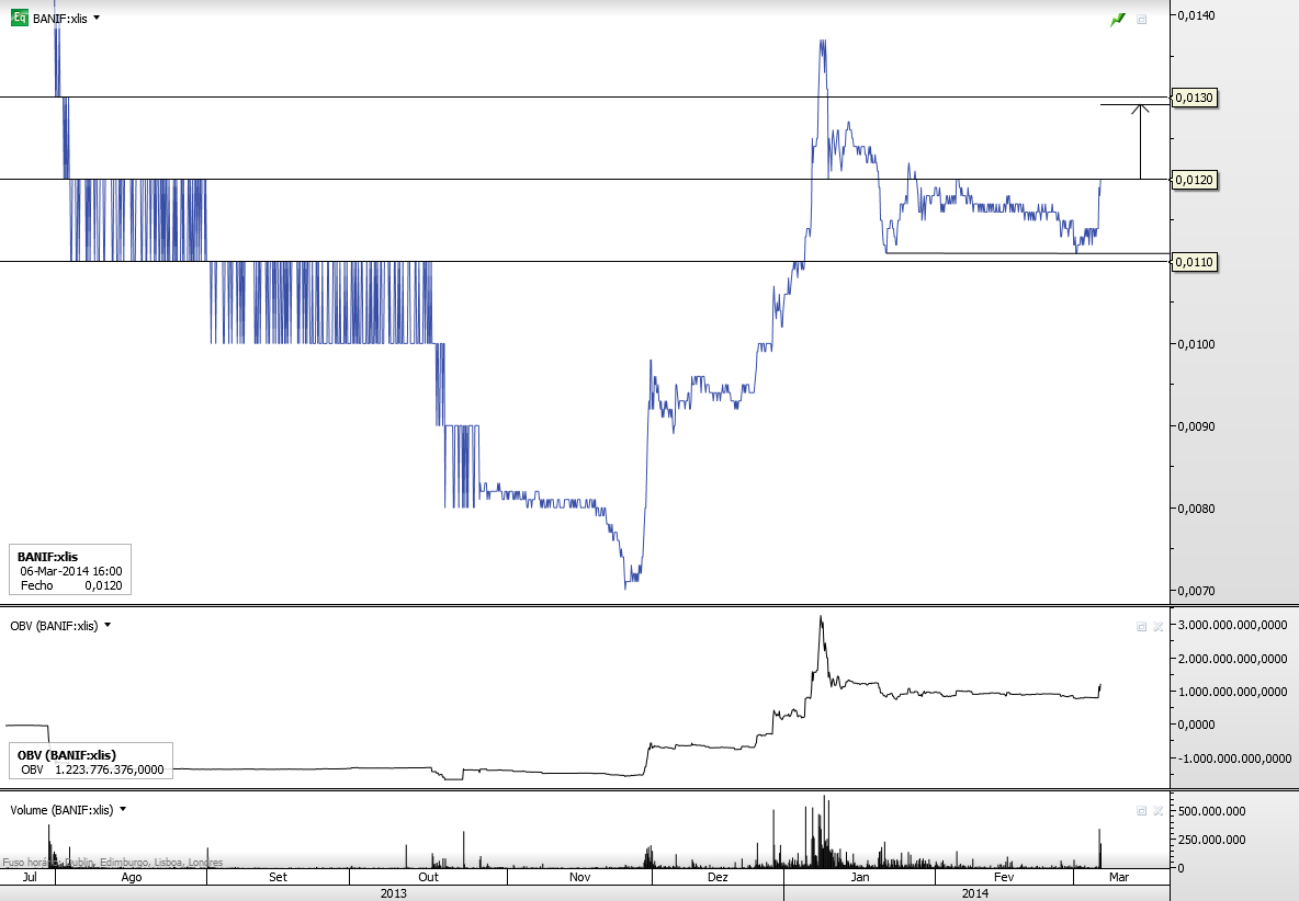 Também indiquei, no tópico do sistema "Emocional" em que me refiro à carteira que detenho, que a tendência na escala diária passaria a descendente se brevemente o Banif viesse a fechar igual ou abaixo dos 0,0104. Aí a melhor estratégia seria "shortar" o papel.