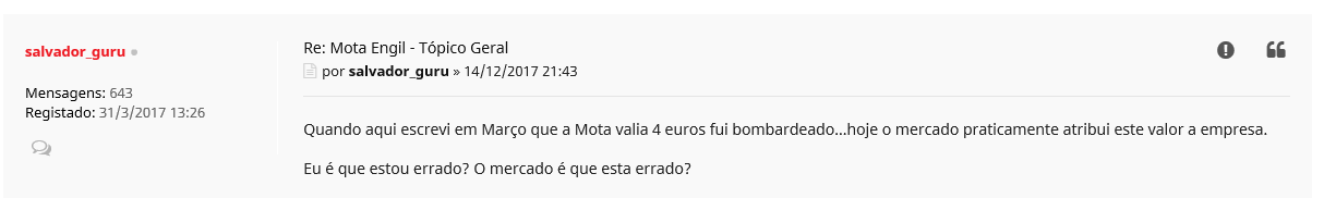 5. O GURU para mim tinha já uma credibilidade ZERO nas afirmações , desde que quando presumivelmente tinha MOTA em carteira dizia MOTA valia 4 e ia subir aos 6 e assim vendeu disse MOTA já não tinha esse valor e ia cair forte como se a MOTA oscilasse os fundamentais em meia dúzia de meses .