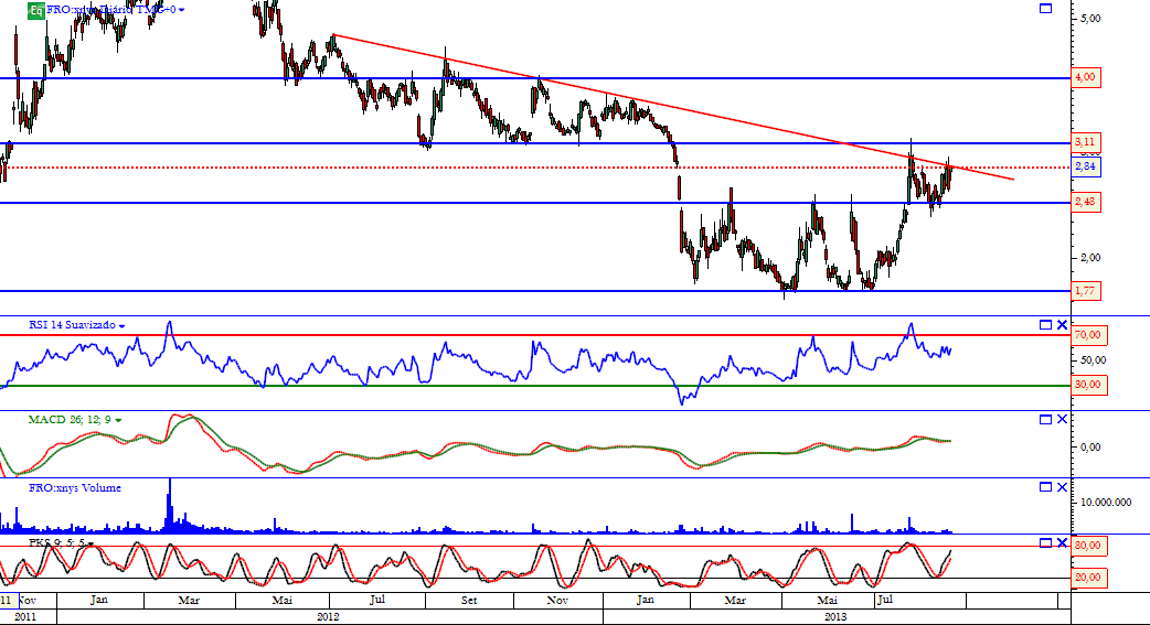 A FRO lá conseguio fazer um reteste positivo, restam agora mais dois obstáculos (de peso diria) a serem superados. O breakout da LTd e da resistência a 3,11€ +-