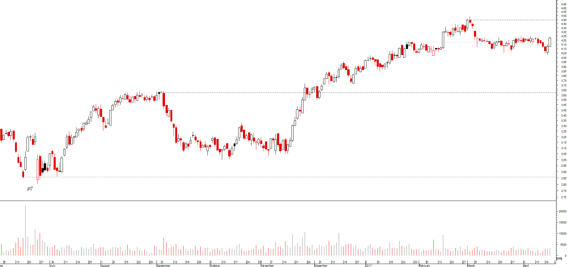 Penso que a primeira barreira está nos 4,26€. Eu entrei hoje nesta cotada com uma pequena quantidade de acções adquiridas a 4,207€.