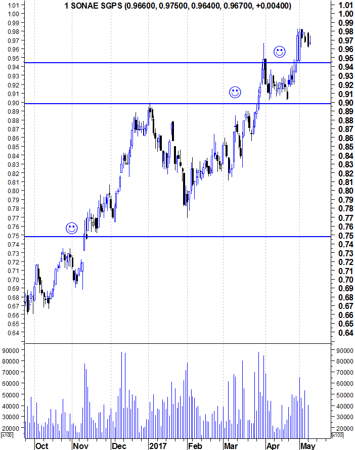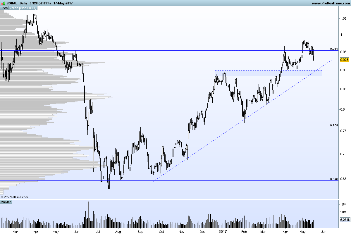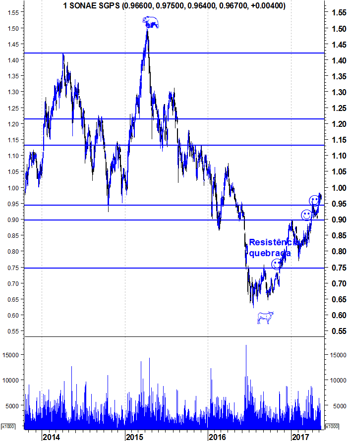 Esta cotada, embora venha a apresentar um bom volume, parece que agora "abrandou" a sua evolução. Com a noticia da Haitong, onde esta prevê uma quebra de 87% dos lucros da Sonae ( http://www.jornaldenegocios.pt//mercado ... _Destaques ), será que esta cotada corrigirá até aos 0,90 ou passe o 1€, com uma interpretação "positiva" à notícia, onde se pode ler um possível aumento do EBITDA e vendas?