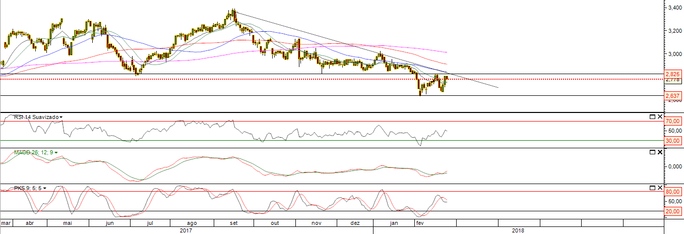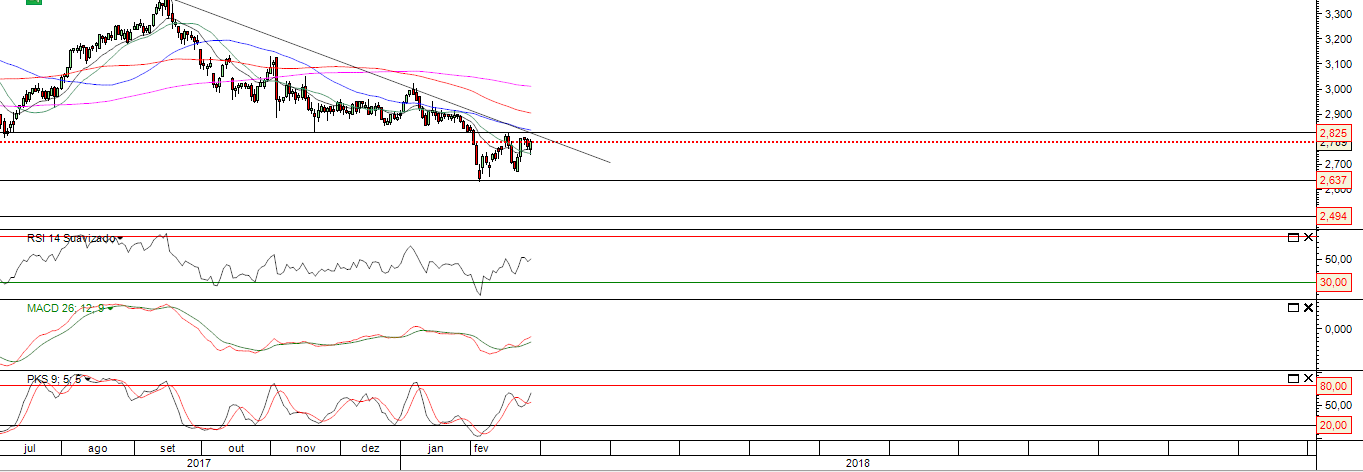 Reagiu numa zona de suporte mas com duas tentativas não conseguiu superar a resistência, ainda tem algumas hipóteses de ir aos 2.87; mas na minha opinião com mais ou menos retrações o caminho parece ser para o suporte no Mensal nos 2.40, veremos