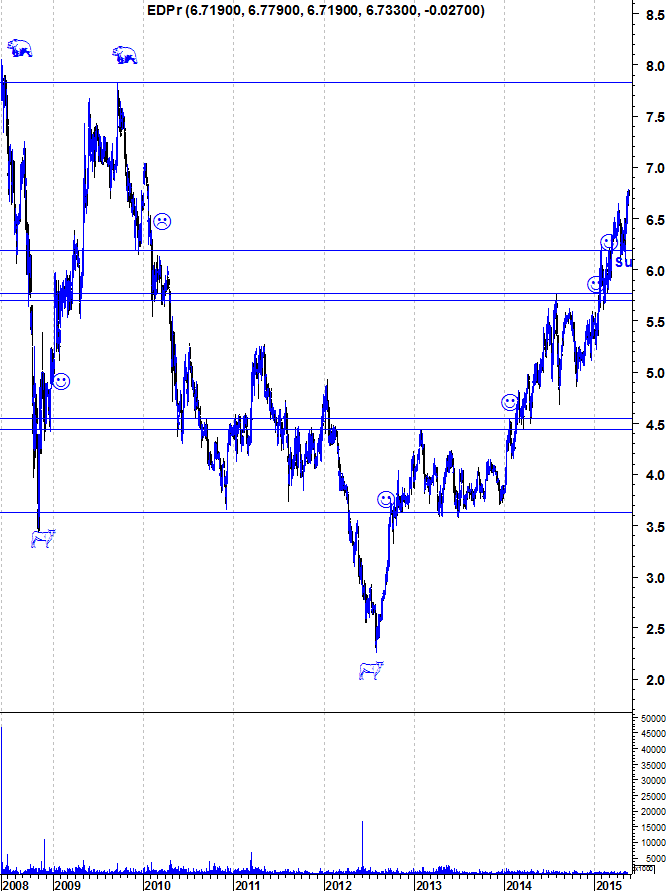 O que me faria despir este fato de touro que trago vestido há tanto tempo na EDP Renováveis? Em termos de curto prazo, a quebra do suporte na zona dos 6,2 euros. Em termos de médio prazo, a ruptura do forte suporte na zona dos 5,7 euros. Em termos de longo prazo, apenas despirei o meu fato de touro na quebra do decisivo suporte na casa dos 4,4 euros.