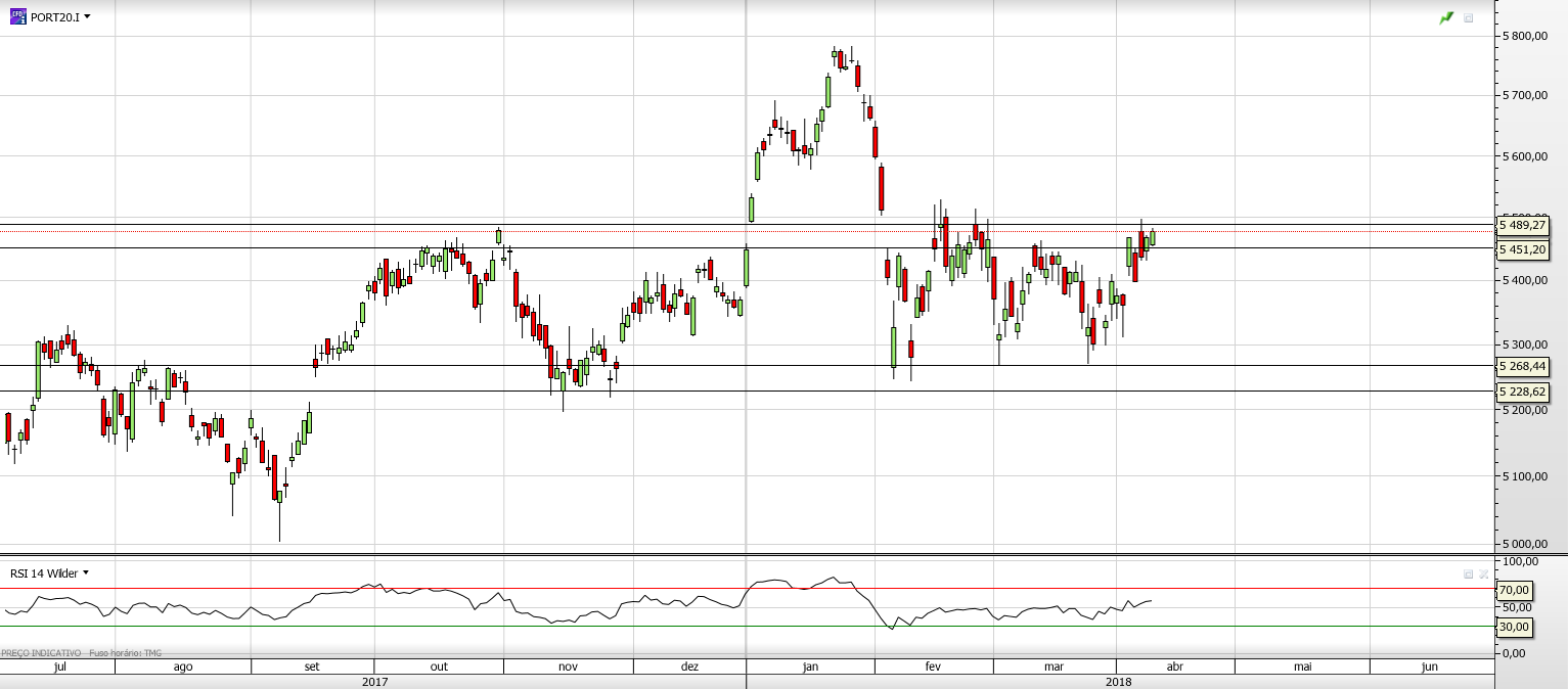 Mantem a zona de negociação há muito identificada entre 5300 - 5460/5500.