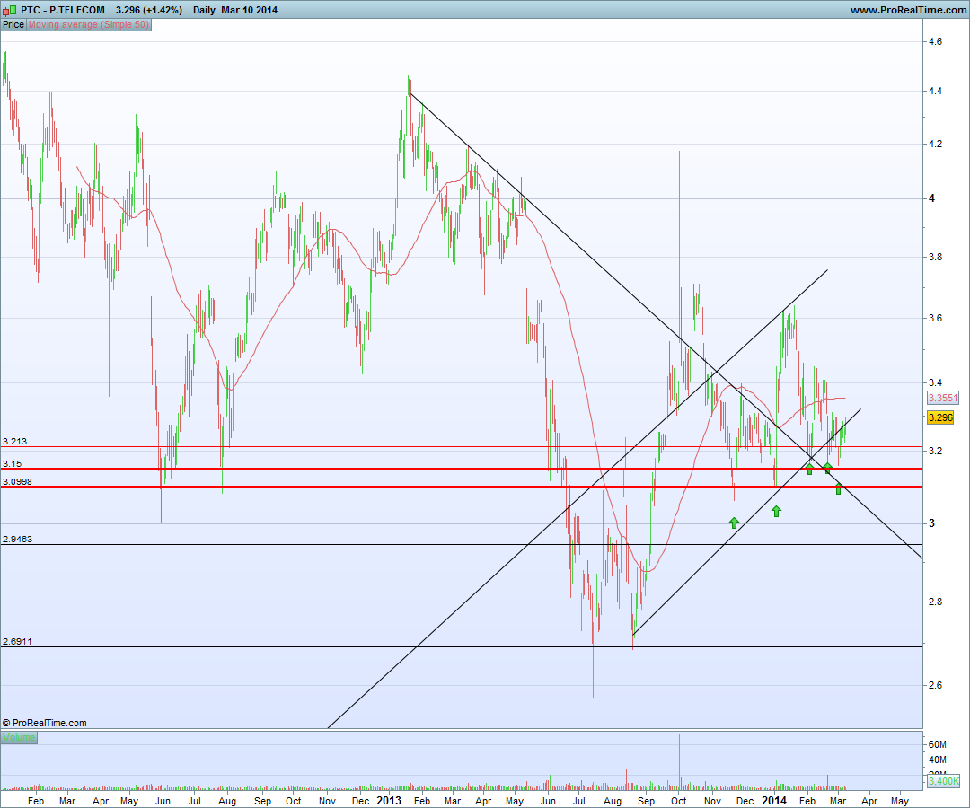 Amigo, fica aqui o gráfico, que penso ser o mais correto neste momento: Tem de quebrar a LT com consistência para assistirmos realmente à subida da PT! Há quem não se oriente pelo gráfico da PT pelo facto da fusão com a OI, verdade é que ainda há pouco tempo consegui comprar onde para mim é um suporte (3.15 aproximadamente ) e vendi onde acho que vai ser dificil quebrar ( a LT ). Ontem fechou acima da LT e hoje era excelente continuar, mas como podes reparar voltou para trás da LT. Mas cada um tem a sua análise e a sua estratégia!! Só te coloquei o gráfico para veres realmente porque é que ela não passa disto ( enquanto ).