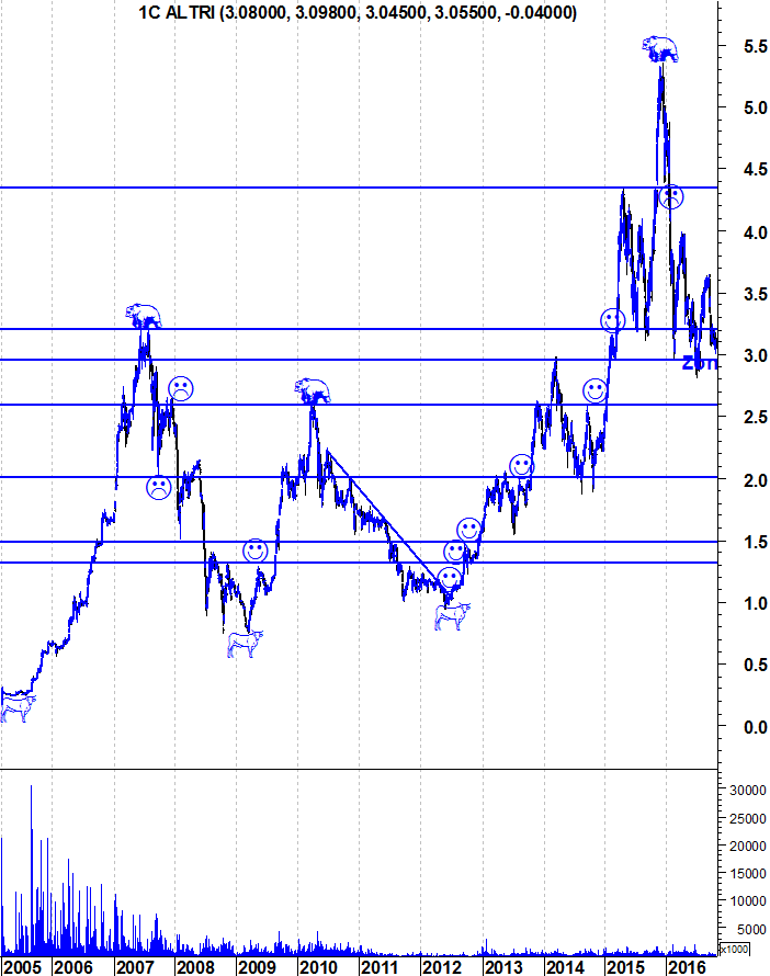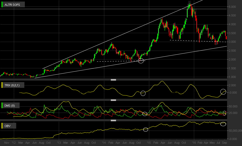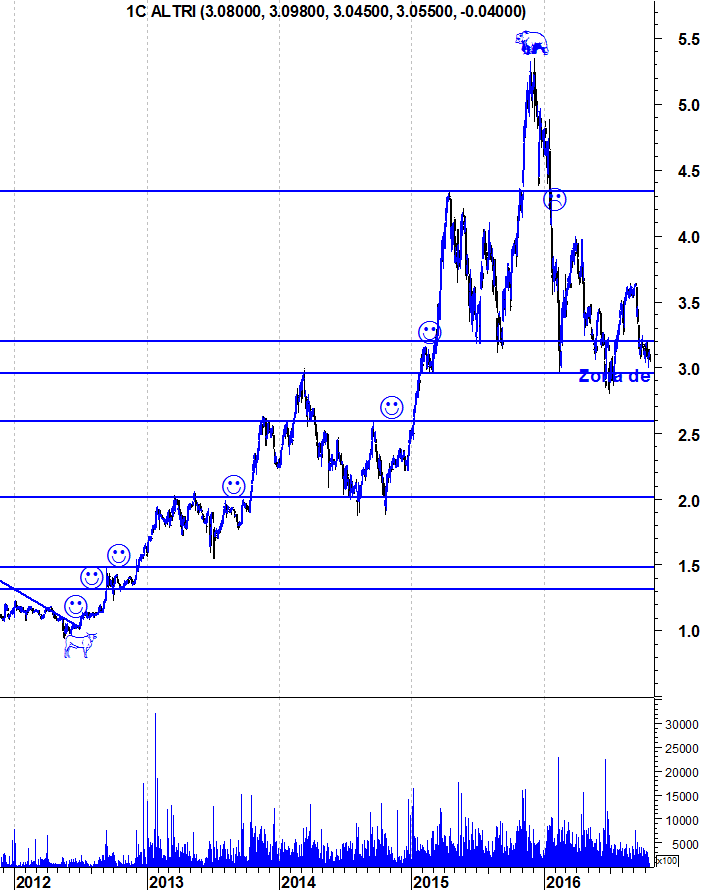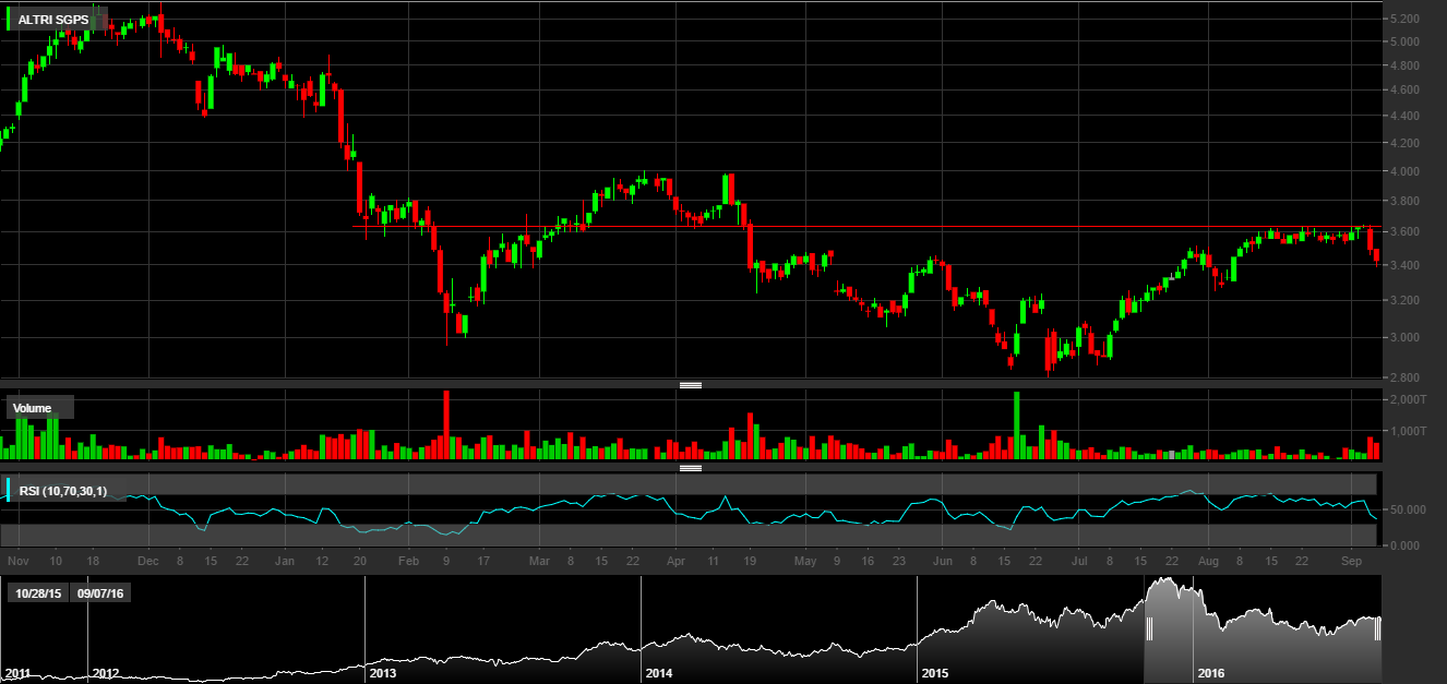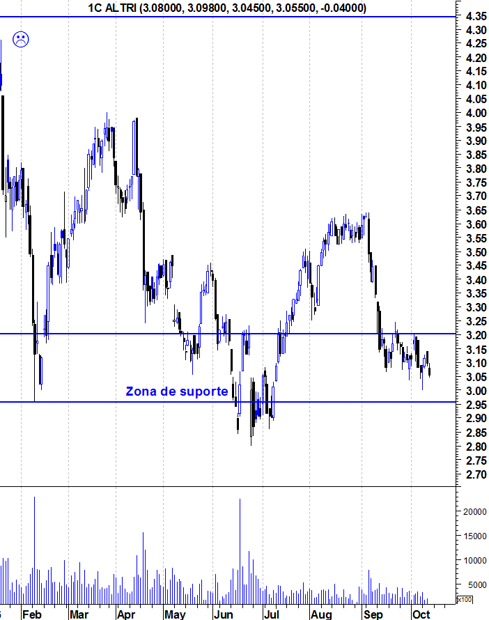 Observando os últimos 14 meses - que, recordo, não foram favoráveis à bolsa portuguesa: e com isto sublinho que o comentário radica de uma base pessimista - diria que a ALTRI , apesar de fixada em terreno perigoso (em cima do suporte dos últimos 2 anos) está graficamente apetecível.