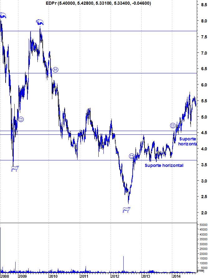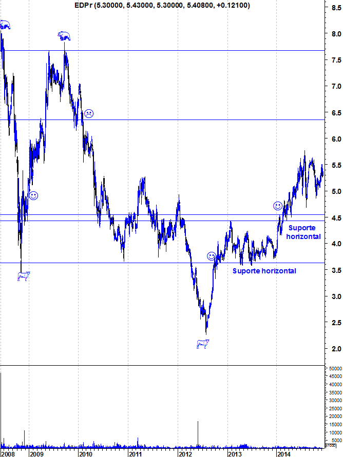 Aqui ficam os gráficos actualizados da EDPR que continua a não atrair as atenções do fórum mas que continua o seu "Bull Market" e, enquanto a zona de suporte entre os 4,4 e 4,55 não for quebrada, os touros dominam a acção em todos os horizontes temporais.