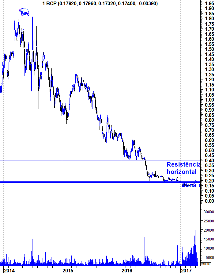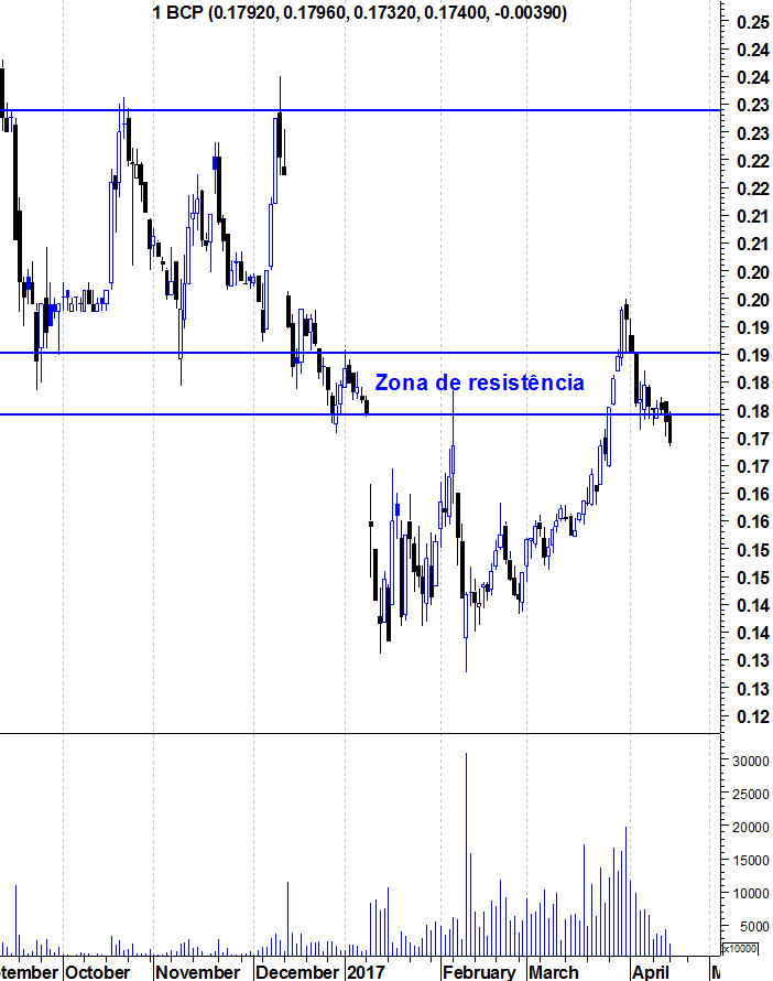 Volto a reafirmar aquilo que tenho vindo a dizer nas últimas semanas: Ao contrário do PSI, o BCP não quebrou consistentemente a sua zona de resistência entre os 0,18 e os 0,19 euros. Enquanto isso não suceder, os ursos continuam no comando da situação em termos de médio e longo prazo.