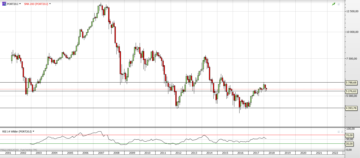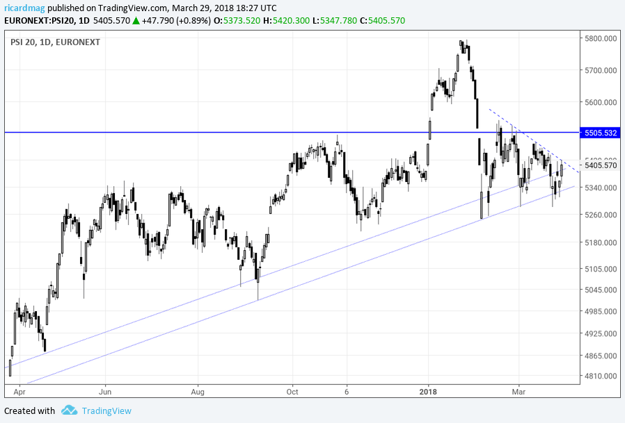 Regressado de uma semana de ausência do Caldeirão, o PSI aproveitou a minha ausência para cair. Olhando para o gráfico não houve nenhuma alteração significativa. OS touros continuam a dominar no médio e longo prazo mas o curto prazo continua em terra de ninguém. Os touros precisam de voltar a conquistar os 5500 pontos para dominarem também no curto prazo, enquanto os ursos precisam que o PSI quebre a zona de suporte nos 5050 pontos para colocarem o domínio dos touros no médio e longo prazo em causa.