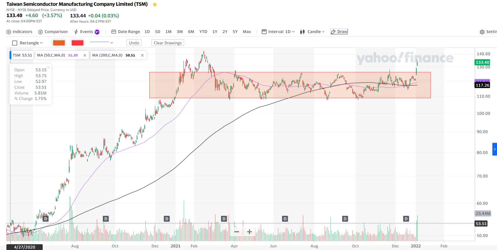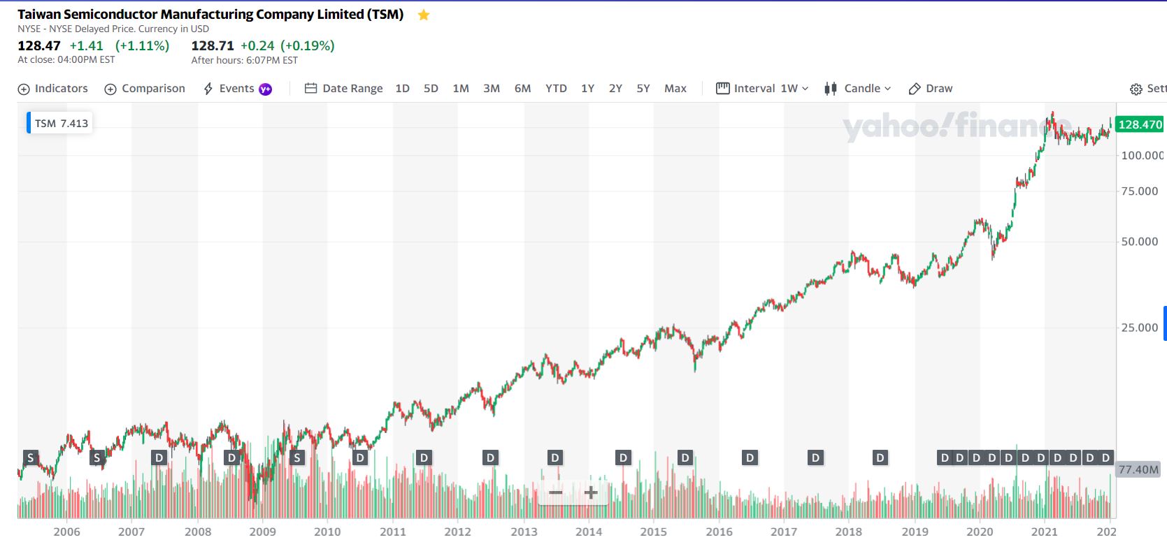 Fica o gráfico diário da TSM, fabricante semicondutores de Taiwan, uma das maiores empresas do sector. Até ser bombardeada pela China continental, um dia destes.