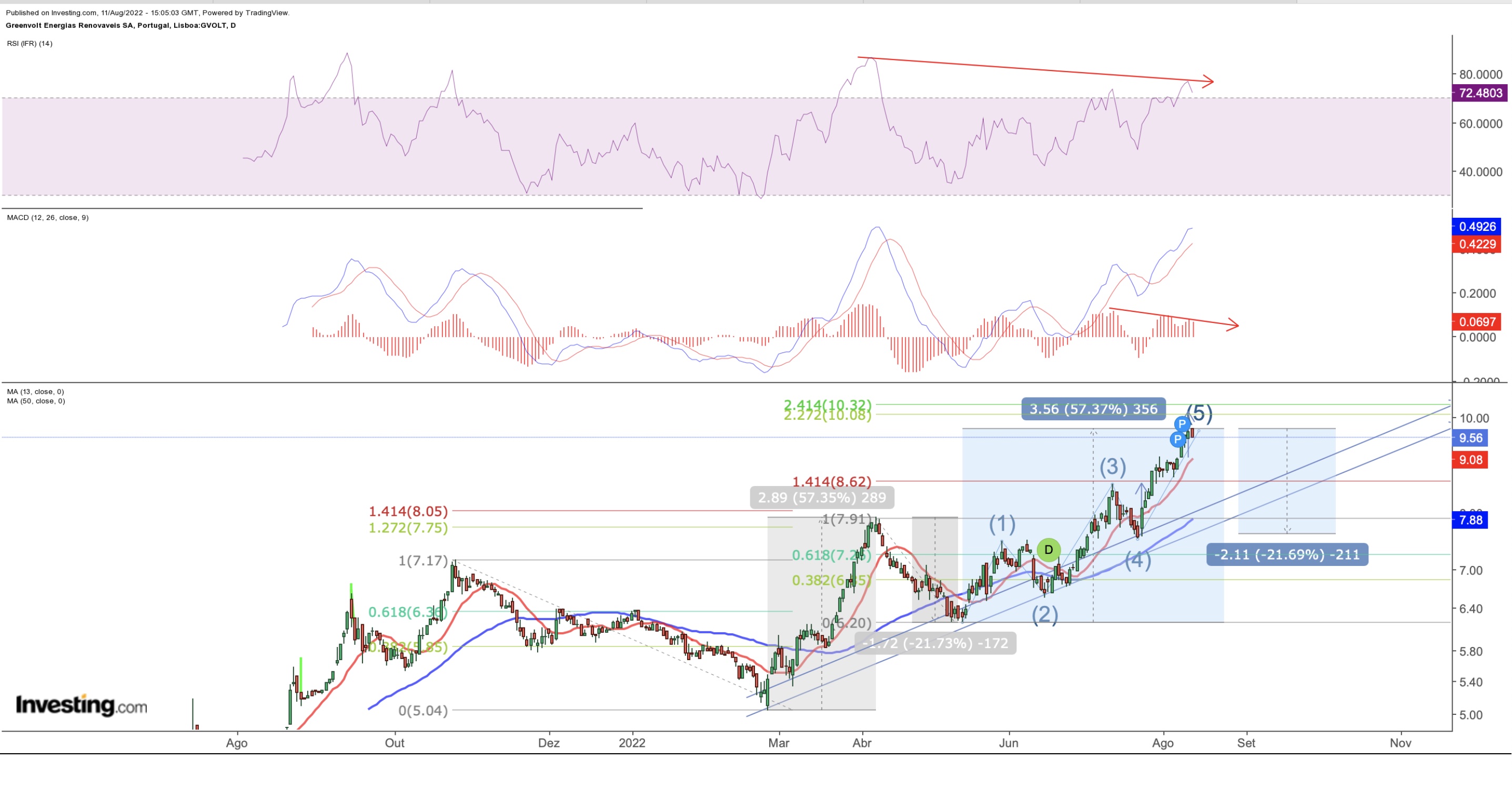 A greenvolt fez agora nos 9,75eur, cerca de 57 % de valorização, desde última retração. O impulso anterior foi exactamente de 57%, que levou de seguida a uma correcção de cerca de 21%...será aqui o topo da onda 5, ou esta onda ainda tem mais para dar ?