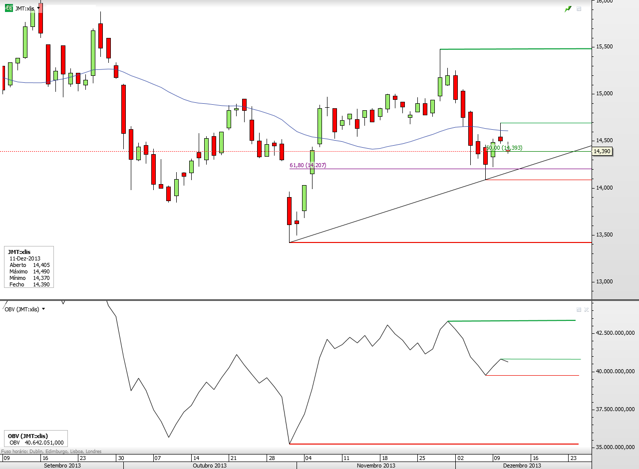 A JM, finalmente, parece querer sair da lateralização dos últimos tempos... se assim for, poderá ter valorizações significativas, sobretudo se conseguir ultrapassar os 14,50, valor que durante estes últimos tempos tem servido de resistência à progressão da ação.