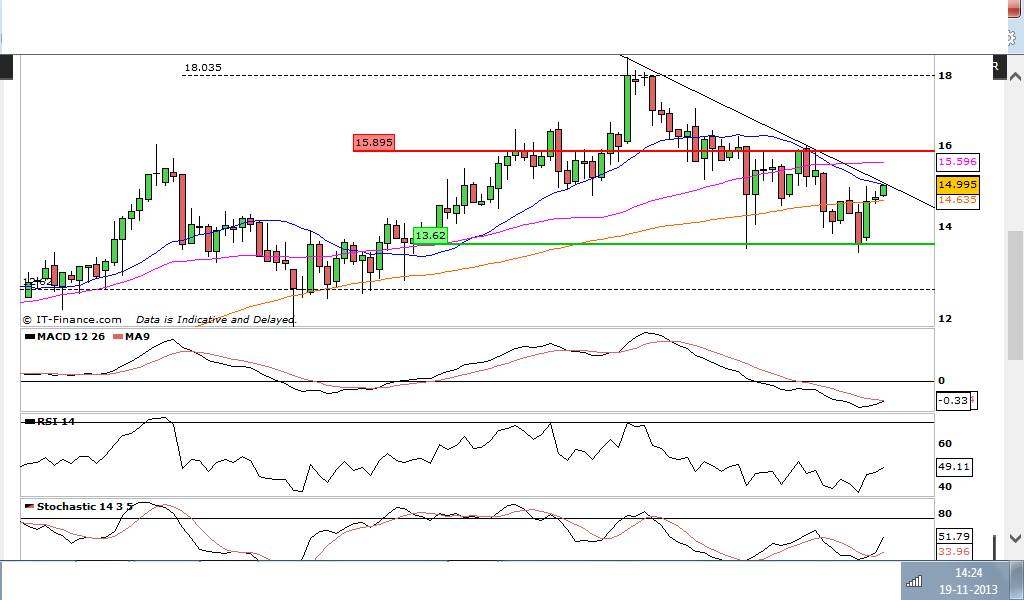 Apesar de não ser visível na análise técnica existe uma forte resistência nos 15.00€, muito mais incomodativa que a linha de tendência descendente. Nos 15€ há sempre imensas ordens de venda e por dois dias consecutivos bateu lá e voltou para trás. Algum dia de boas notícias ou apanhando um empurrãozinho do PSI pode ser que passe os 15€ e aí sim vai disparar. Até lá... anda por aqui a marinar.
