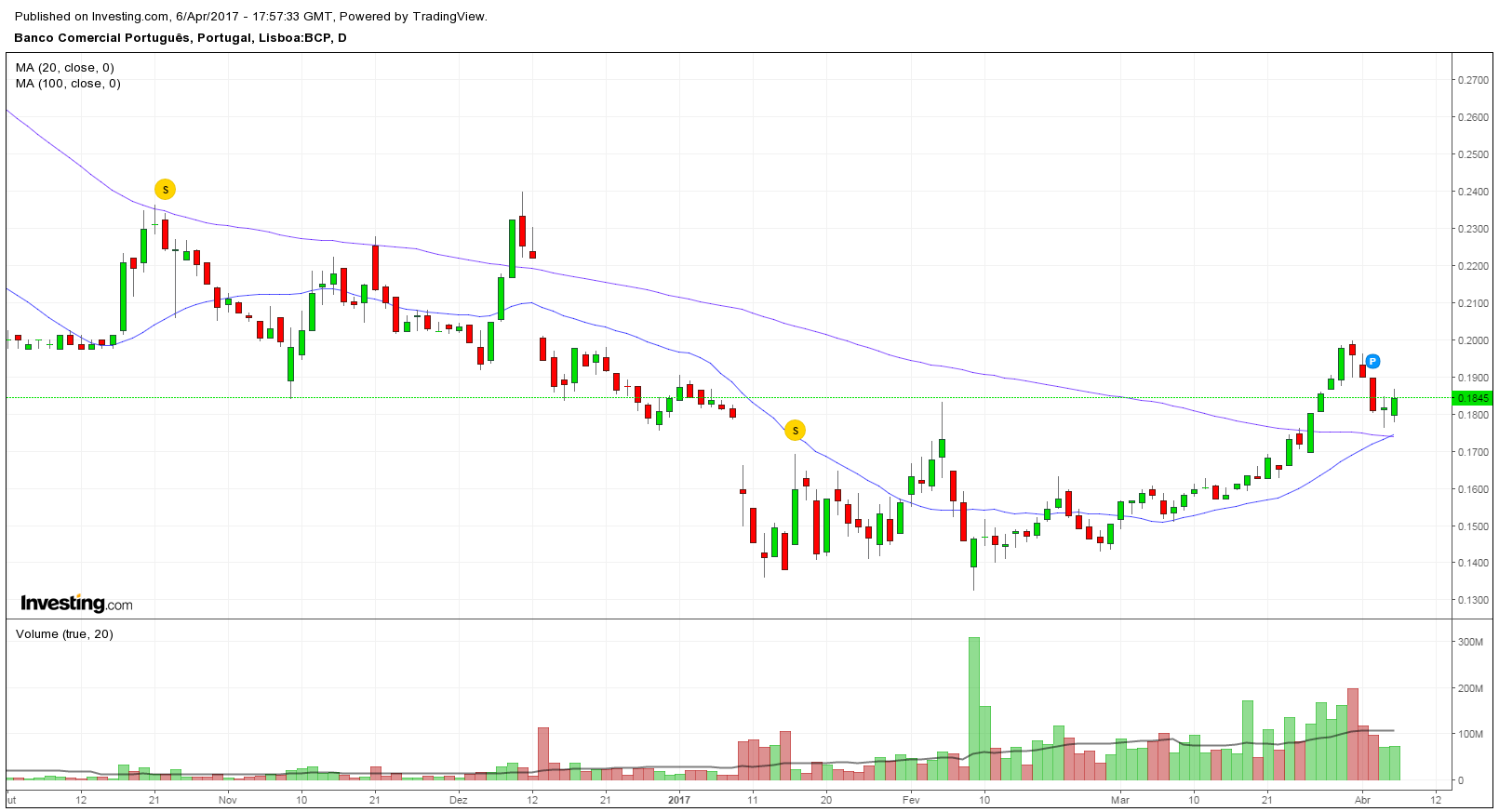 Parece que o BCP está tecnicamente com muito bom aspecto. Vale o que vale, mas hoje fez também uma golden cross com as médias móveis das últimas 20 e 100 sessões. A última vez que tal aconteceu foi no início de Março de 2015! Reentrei hoje ao fim de largos meses.