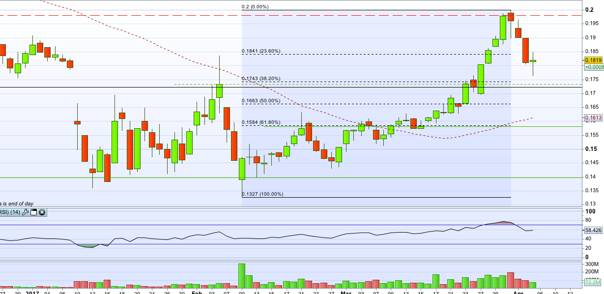 na minha opinião, a perna com origem no minimo absoluto de 09/02 e maximo no dia 21/02 já teve a sua retração pelo que considero que os niveis de Fibo só se aplicam a partir do minimo de 27/02 nos 0.143 aprox. já que essa perna sim ainda não tinha tido qualquer retração de relevo até ao maximo alcançado nos 0.20.